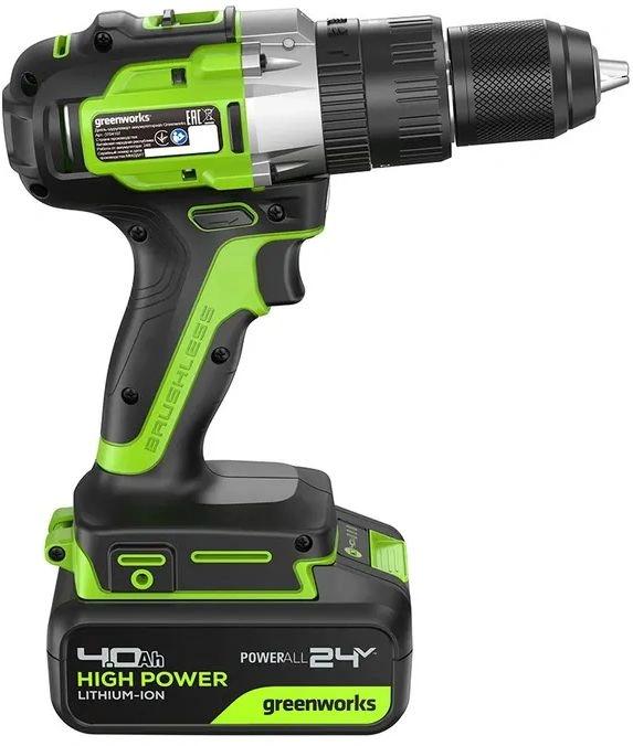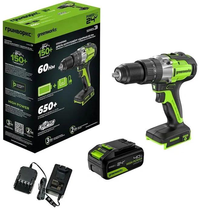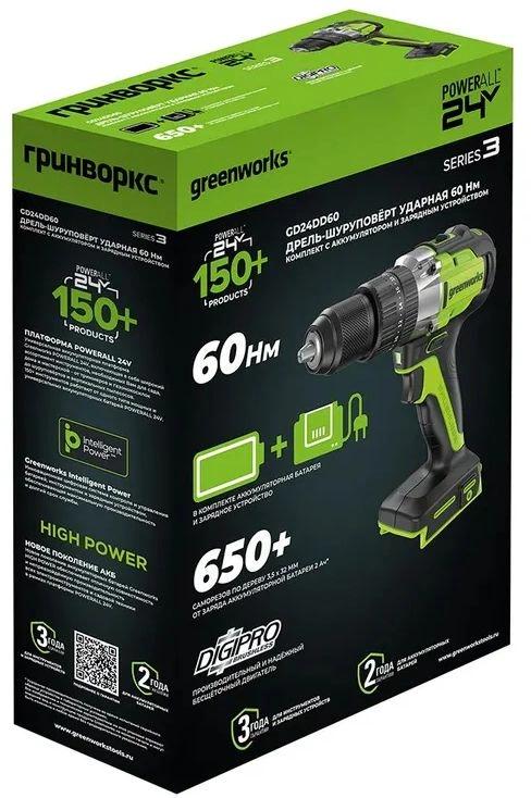 | Комплект поставки | Дрель-шуруповерт ударная Greenworks GD24DD60; поясная клипса + винт; АКБ 4Ач; зарядное устройство; руководство по эксплуатации; гарантийный талон; картонная коробка |