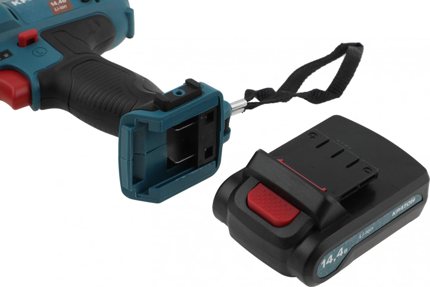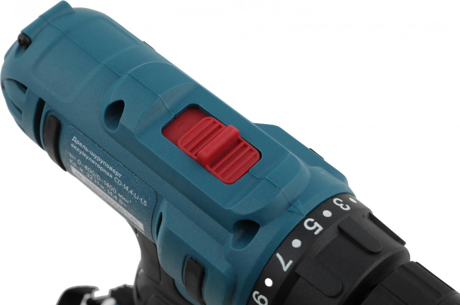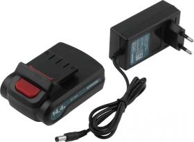 | Комплект поставки | Дрель-шуруповерт, зарядное устройство, батарея аккумуляторная Li-ion, 14 В, 1,5 А·ч - 2 шт., сверло HSS 1,5; 2,5; 3; 4; 5; 6 мм - 6 шт., держатель бит магнитный, L = 60 мм., CR-V биты (насадки отверточные), 25 мм., 3; 4; 5; 6; PH1; PH2; T15; T20; H4; H5 - 10 шт., скоба. |