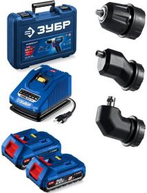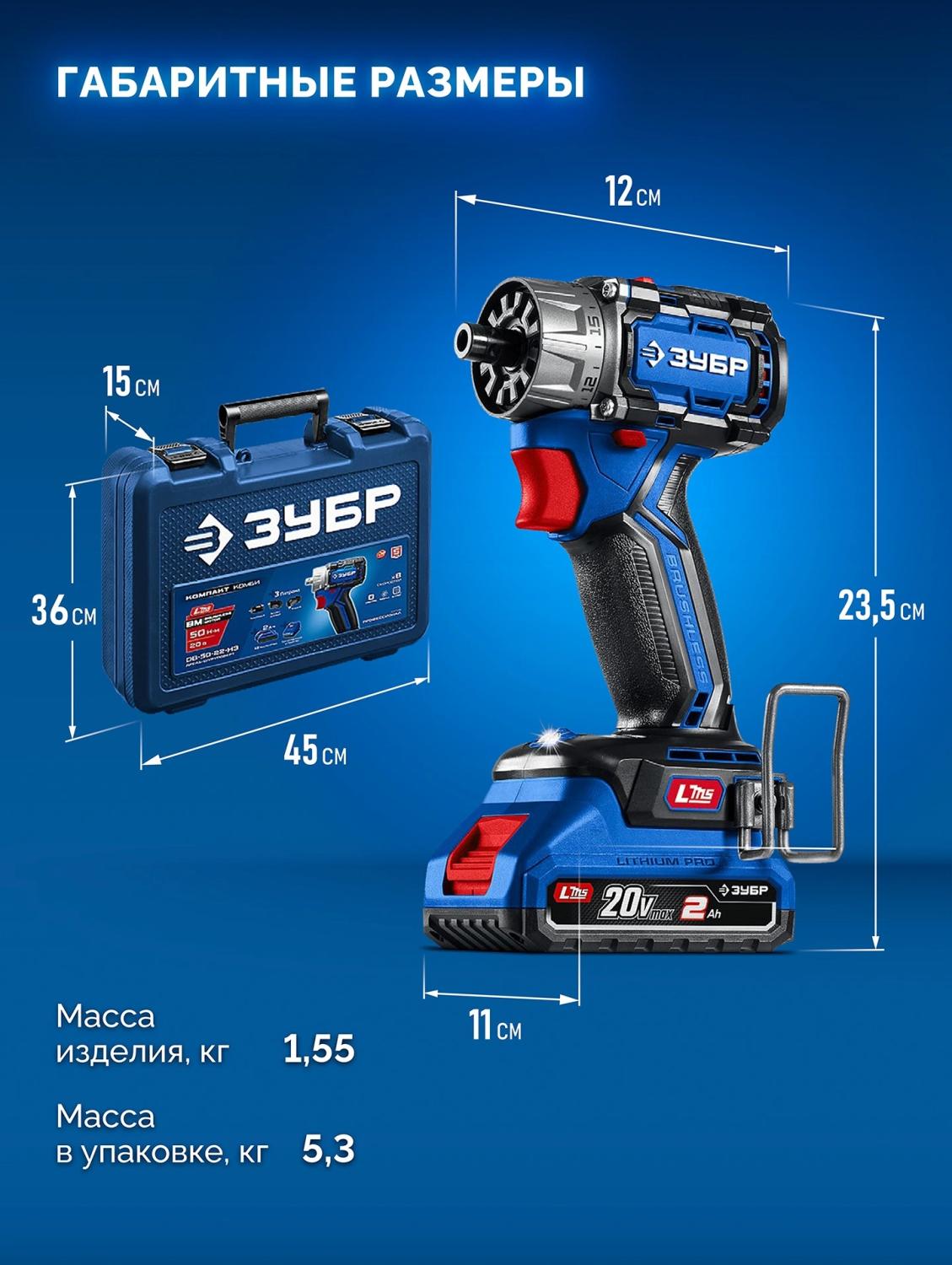 Дрель-шуруповёрт аккумуляторная Зубр бесщёточная 2 АКБ х Li-ion (20 В, 2 Ач)+ЗУ в кейсе (DB-50-22-H3)<br><br>Высокотехнологичная модель в новой линейке аккумуляторного инструмента Зубр серии LMS. Компактная дрель-шуруповёрт профессионального уровня с передовым Brushless двигателем. Крутящий момент 50 Нм и небольшой вес делают его удобным для наиболее распространённых работ — сверление дерева и металла, заворачивание крепежа диаметром до 8 мм, перемешивание ЛКМ и прочее. 3 сменных патрона в комплекте для расширения функциональности. Комплектация с двумя аккумуляторами позволяет работать практически без остановки.<br><br>Применение<br>Для сверления отверстий в различных материалах (при установке соответствующих свёрл), закручивания/откручивания резьбовых соединений (при установке соответствующих бит),перемешивания ЛКМ (при установке соответствующих насадок)<br><br>Преимущества<br>• Единая аккумуляторная система LMS для 500+ инструментов<br>• Технологичный инструмент для средних работ<br>• Современные аккумуляторы универсальной системы LMS повышенной ёмкости 2.0 Ач позволяет инструменту работать дольше и эффективнее<br>• Бесщёточный BM-Motor двигатель обладает рядом преимуществ по сравнению с щёточным двигателем:<br>— высокий крутящий момент,<br>— высокий КПД благодаря максимально эффективному преобразованию электромагнитной энергии в механическую (ввиду отсутствия перекоммутаций),<br>— повышенная надёжность ввиду отсутствия искрения, трения и трущихся деталей,<br>— низкое энергопотребление (до 4 раз дольше работа на одном заряде батареи),<br>— высокая степень защиты двигателя благодаря интеллектуальному управлению,<br>— гибкая регулировка крутящего момента и поддержка его на максимальном уровне при любых оборотах,<br>— отсутствие перекоммутаций в коллекторе и, соответственно, отсутствие нагрева и потерь из-за переходных сопротивлений<br>• Компактный корпус и малый вес для удобства при длительной работе и доступа в ограниченные места<br>• Достаточный крутящий момент и высокая надёжность благодаря оптимальному подбору параметров пары двигатель-редуктор<br>• 8 (2 физических х 4 электронных) скоростей вращения благодаря инновационному режиму ограничения максимальной скорости. Обеспечивает возможность старта изделия с микрооборотов для особо ответственных отверстий или аккуратного закручивания<br>• Набор сменных патронов:<br>— кулачковый БЗП 1.5-13 мм для установки бит и сверел<br>— эксцентриковый HEX 1/4’’ для закручивания вплотную к упору<br>— угловой HEX 1/4’’ для закручивания в узких местаx<br>• Выходной вал с внутренним шестригранником позволяет устанавливать биты непосредственно на вал (без патрона), увеличивая компактность<br>• Электронный тормоз двигателя для исключения выбега при остановке<br>• Широкий диапазон регулировки крутящего момента с равномерным нарастанием момента во всём диапазоне<br>• Высокотоковое зарядное устройство с принудительным охлаждением для быстрой зарядки аккумулятора. Включает порт USB-type C, что позволяет заряжать носимые устройства<br>• Трехрежимная (выключено, включение с инструментом, фонарь) подсветка рабочего места не перекрывается патроном<br>• Проволочная скоба крепления на поясе и держатель бит<br>• Мягкие накладки на рукоятке повышают удобство хвата<br>• Вместительный кейс в комплекте для хранения и переноски<br><br>К