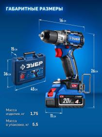 Дрель-шуруповёрт аккумуляторная Зубр бесщёточная 2 АКБ х Li-ion (20 В, 4 Ач)+ЗУ в кейсе (DB-50-42)<br><br>Описание<br>Высокотехнологичная модель в новой линейке аккумуляторного инструмента Зубр серии LMS. Компактная дрель-шуруповёрт профессионального уровня с передовым Brushless двигателем. Крутящий момент 50 Нм и небольшой вес делают его удобным для наиболее распространённых работ — сверление дерева и металла, заворачивание крепежа диаметром до 8 мм, перемешивание ЛКМ и прочее. Комплектация с двумя ёмкими аккумуляторами позволяет работать практически без остановки.<br><br>Применение<br>Для сверления отверстий в различных материалах (при установке соответствующих свёрл), закручивания/откручивания резьбовых соединений (при установке соответствующих бит),перемешивания ЛКМ (при установке соответствующих насадок).<br><br>Преимущества<br>• Единая аккумуляторная система LMS для 500+ инструментов<br>• Технологичный инструмент для средних работ<br>• Современные аккумуляторы универсальной системы LMS повышенной ёмкости 4.0 Аxч позволяет инструменту работать дольше и эффективнее<br>• Бесщёточный BM-Motor двигатель обладает рядом преимуществ по сравнению с щёточным двигателем:<br>— высокий крутящий момент,<br>— высокий КПД благодаря максимально эффективному преобразованию электромагнитной энергии в механическую (ввиду отсутствия перекоммутаций),<br>— повышенная надёжность ввиду отсутствия искрения, трения и трущихся деталей,<br>— низкое энергопотребление (до 4 раз дольше работа на одном заряде батареи),<br>— высокая степень защиты двигателя благодаря интеллектуальному управлению,<br>— гибкая регулировка крутящего момента и поддержка его на максимальном уровне при любых оборотах,<br>— отсутствие перекоммутаций в коллекторе и, соответственно, отсутствие нагрева и потерь из-за переходных сопротивлений<br>• Компактный корпус и малый вес для удобства при длительной работе и доступа в ограниченные места<br>• Достаточный крутящий момент и высокая надёжность благодаря оптимальному подбору параметров пары двигатель-редуктор<br>• 8 (2 физических х 4 электронных) скоростей вращения благодаря инновационному режиму ограничения максимальной скорости. Обеспечивает возможность старта изделия с микрооборотов для особо ответственных отверстий или аккуратного закручивания<br>• Быстрозажимной одномуфтовый патрон для максимальной простоты и скорости замены расходного инструмента. Переднее вращающееся кольцо предотвращает повреждение материала<br>• Электронный тормоз двигателя для исключения выбега при остановке<br>• Широкий диапазон регулировки крутящего момента с равномерным нарастанием момента во всём диапазоне<br>• Высокотоковое зарядное устройство с принудительным охлаждением для быстрой зарядки аккумулятора. Включает порт USB-type C, что позволяет заряжать носимые устройства<br>• Трехрежимная (выключено, включение с инструментом, фонарь) подсветка рабочего места не перекрывается патроном<br>• Проволочная скоба крепления на поясе и держатель бит<br>• Мягкие накладки на рукоятке повышают удобство хвата<br>• Вместительный кейс в комплекте для хранения и переноски<br><br>Комплектация<br>• Дрель-шуруповёрт<br>• Аккумулятор (2 шт)<br>• Зарядное устройство<br>• Скоба поясная<br>• Бита 50 мм<br>• Битодержатель<br>• Кейс<br>• Руководство по эксплуатации<br><br>Базовая гарантия сроком 3 г