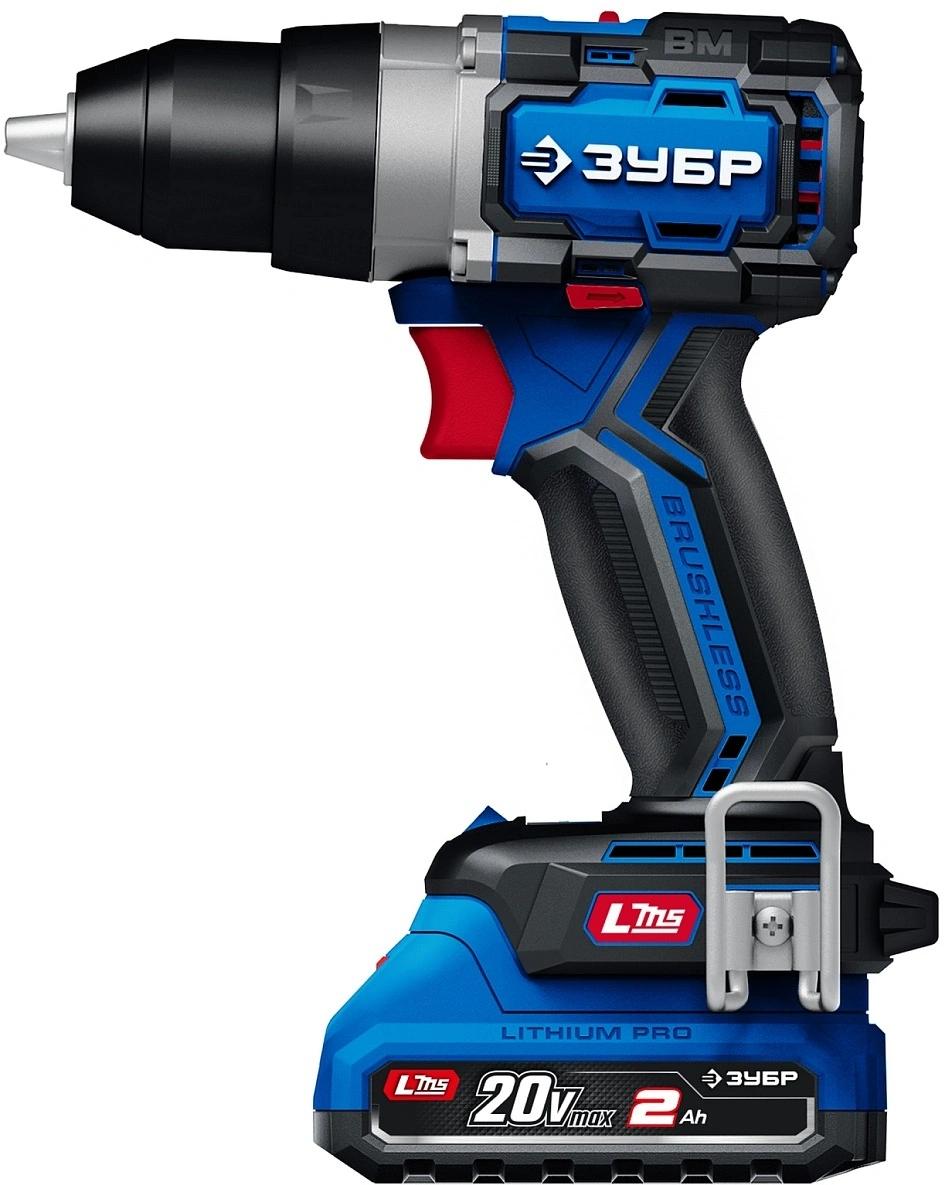 Дрель-шуруповёрт аккумуляторная Зубр бесщёточная 2 АКБ х Li-ion (20 В, 2 Ач)+ЗУ в кейсе (DB-70-22)<br><br>Высокотехнологичная модель в новой линейке аккумуляторного инструмента Зубр серии LMS. Дрель-шуруповёрт профессионального уровня с передовым Brushless двигателем.<br>Высокий крутящий момент 70 Нм, надёжность конструкции и отличная эргономика позволяют выполнять практически любую работу — сверление дерева сверлом Левиса, сверление металла ступенчатым сверлом, заворачивание крепежа диаметром до 12 мм, перемешивание ЛКМ и прочее.<br>Комплектация с двумя аккумуляторами позволяет работать практически без остановки.<br><br>Применение<br>Для ледобура (рыбалки), сверления отверстий в различных материалах (при установке соответствующих свёрл), закручивания/откручивания резьбовых соединений (при установке соответствующих бит),перемешивания ЛКМ (при установке соответствующих насадок).<br><br>Преимущества<br>• Единая аккумуляторная система LMS для 500+ инструментов<br>• Технологичный инструмент для трудных работ<br>• Современные аккумуляторы универсальной системы LMS повышенной ёмкости 2.0 Ач позволяет инструменту работать дольше и эффективнее<br>• Бесщёточный BM-Motor двигатель обладает рядом преимуществ по сравнению с щёточным двигателем:<br>— высокий крутящий момент,<br>— высокий КПД благодаря максимально эффективному преобразованию электромагнитной энергии в механическую (ввиду отсутствия перекоммутаций),<br>— повышенная надёжность ввиду отсутствия искрения, трения и трущихся деталей,<br>— низкое энергопотребление (до 4 раз дольше работа на одном заряде батареи),<br>— высокая степень защиты двигателя благодаря интеллектуальному управлению,<br>— гибкая регулировка крутящего момента и поддержка его на максимальном уровне при любых оборотах,<br>— отсутствие перекоммутаций в коллекторе и, соответственно, отсутствие нагрева и потерь из-за переходных сопротивлений<br>• Компактный корпус при крутящем моменте 70 Нм за счёт современных технологий<br>• Высокие крутящий момент и надёжность благодаря оптимальному подбору параметров пары двигатель-редуктор<br>• 8 (2 физических х 4 электронных) скоростей вращения благодаря инновационному режиму ограничения максимальной скорости. Обеспечивает возможность старта изделия с микрооборотов для особо ответственных отверстий или аккуратного закручивания<br>• Усиленный двухскоростной редуктор с металлическим корпусом для передачи значительного крутящего момента<br>• Быстрозажимной одномуфтовый патрон для максимальной простоты и скорости замены расходного инструмента. Переднее вращающееся кольцо предотвращает повреждение материала<br>• Электронный тормоз двигателя исключает выбег при остановке и ускоряет серийную работу<br>• Широкий диапазон регулировки крутящего момента с равномерным нарастанием момента во всём диапазоне<br>• Высокотоковое зарядное устройство с принудительным охлаждением для быстрой зарядки аккумулятора. Включает порт USB-type C, что позволяет заряжать носимые устройства<br>• Дополнительная рукоятка для надёжного удержания и реализации всего потенциала инструмента<br>• Подходит для использования в качестве ледобура (при условии сверления на 1й скорости, буром правого вращения не более 100 мм диаметром)<br>• Трехрежимная (выключено, включение с инструментом, фонарь) подсветка рабочего места не пере