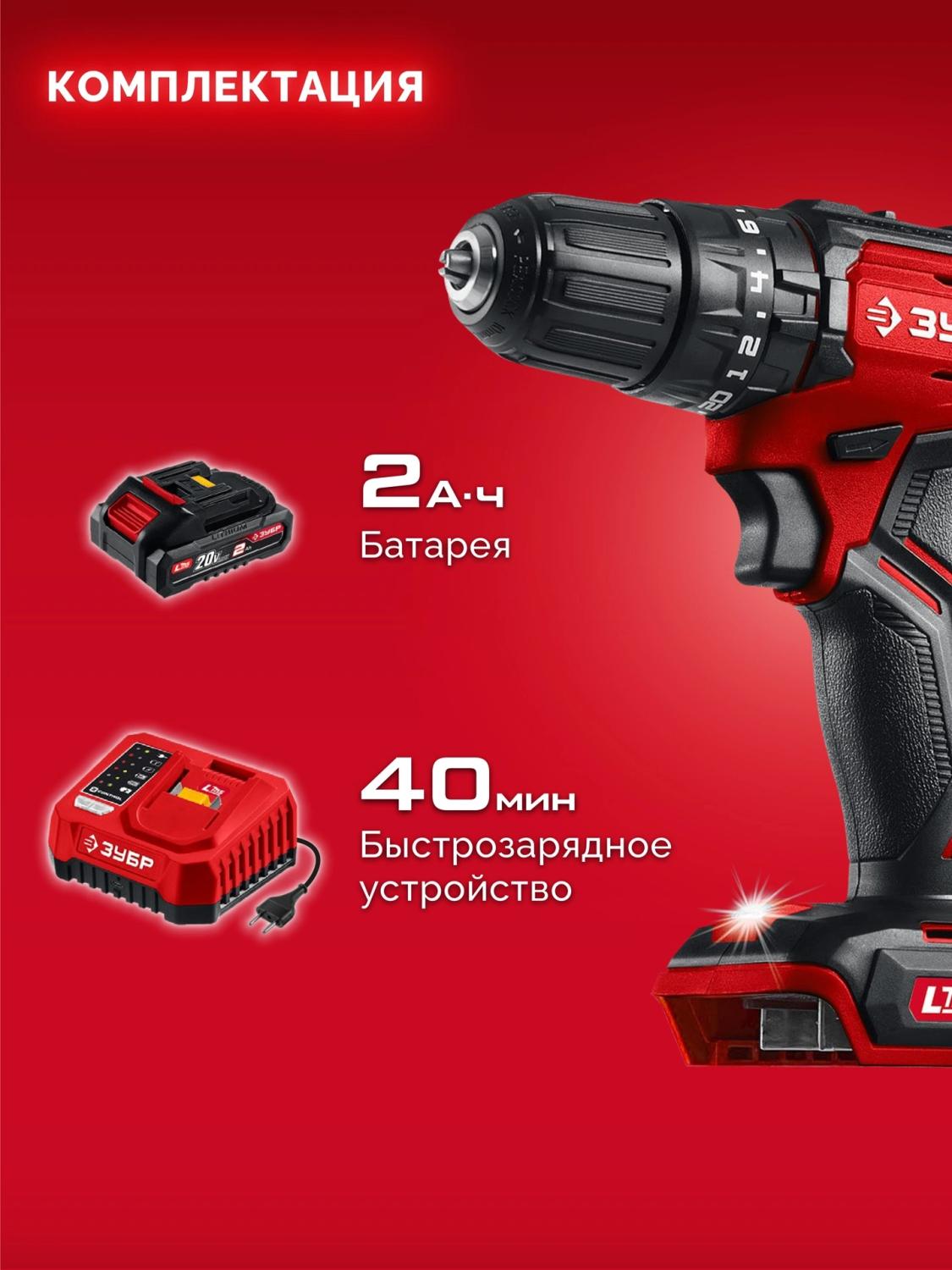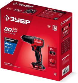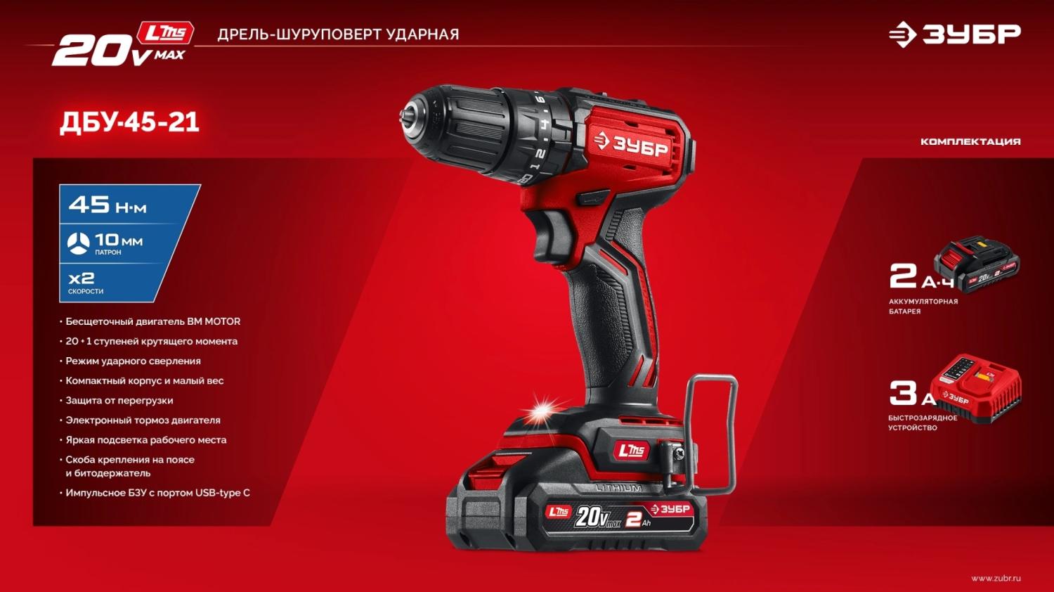 Дрель-шуруповёрт ударная аккумуляторная Зубр бесщёточная АКБ х Li-ion (20 В, 2 Ач)+ЗУ (ДБУ-45-21)<br><br>Бесщёточная дрель-шуруповёрт ударная Зубр обеспечивает как точное заворачивание маленьких саморезов, так и уверенное закручивание крупного крепежа до 8 мм. Компактный размер и современный дизайн делают её удобной для работы. Комплектация с аккумулятором позволяет начать работу сразу после покупки.<br><br>Применение<br>Для сверления отверстий в различных материалах (при установке соответствующих свёрл), закручивания/откручивания резьбовых соединений (при установке соответствующих бит),перемешивания ЛКМ (при установке соответствующих насадок)<br><br>Преимущества<br>• Единая аккумуляторная система LMS для 500+ инструментов<br>• Компактная аккумуляторная дрель-шуруповёрт с двигателем Brushless<br>• Аккумулятор универсальной системы LMS повышенной ёмкости 2.0 Ач позволяет инструменту работать дольше и эффективнее<br>• Бесщёточный Brushless двигатель обладает рядом преимуществ по сравнению с щёточным двигателем:<br>— высокий крутящий момент,<br>— высокий КПД благодаря максимально эффективному преобразованию электромагнитной энергии в механическую (ввиду отсутствия перекоммутаций),<br>— повышенная надёжность ввиду отсутствия искрения, трения и трущихся деталей,<br>— низкое энергопотребление (до 4 раз дольше работа на одном заряде батареи),<br>— высокая степень защиты двигателя благодаря интеллектуальному управлению,<br>— гибкая регулировка крутящего момента и поддержка его на максимальном уровне при любых оборотах,<br>— отсутствие перекоммутаций в коллекторе и, соответственно, отсутствие нагрева и потерь из-за переходных сопротивлений<br>• Высокий крутящий момент при широком диапазоне оборотов благодаря конструкции редуктора<br>• Двухскоростной планетарный редуктор позволяет как заворачивать с большим крутящим моментом, так и сверлить на высоких оборотах<br>• Ударная функция расширяет спектр применения изделия и позволяет сверлить отверстия также в лёгком бетоне<br>• Бесключевой одномуфтовый патрон для максимальной простоты и скорости замены расходного инструмента<br>• Широкий диапазон регулировки крутящего момента превращает изделие в универсальный инструмент: от аккуратного закручивания маленьких винтиков до заворачивания крупных саморезов<br>• Электронный тормоз двигателя для исключения выбега при остановке<br>• Высокотоковое зарядное устройство для быстрой зарядки аккумулятора<br>• Подсветка рабочего места способствует дополнительному удобству при работе в условиях недостаточного освещения<br>• Индикация заряда для контроля состояния батареи<br>• Скоба для крепления на поясе, устанавливаемая с любой стороны инструмента<br>• Реверс<br>• Рукоятка с противоскользящей накладкой<br><br>Комплектация<br>• Дрель-шуруповёрт<br>• Аккумулятор<br>• Зарядное устройство<br>• Бита 50 мм<br>• Скоба поясная<br>• Руководство по эксплуатации<br><br>Базовая гарантия сроком 3 года, при условии только бытового применения. Расширенная гарантия на 5 лет доступна только при условии использования товара в бытовых целях, прохождения периодического обслуживания в авторизованном сервисном центре, при регистрации инструмента на сайте производителя в течение 4-х недель с момента покупки.<br><br>Внешний вид и/или характеристики товара могут быть изменены производителем в 