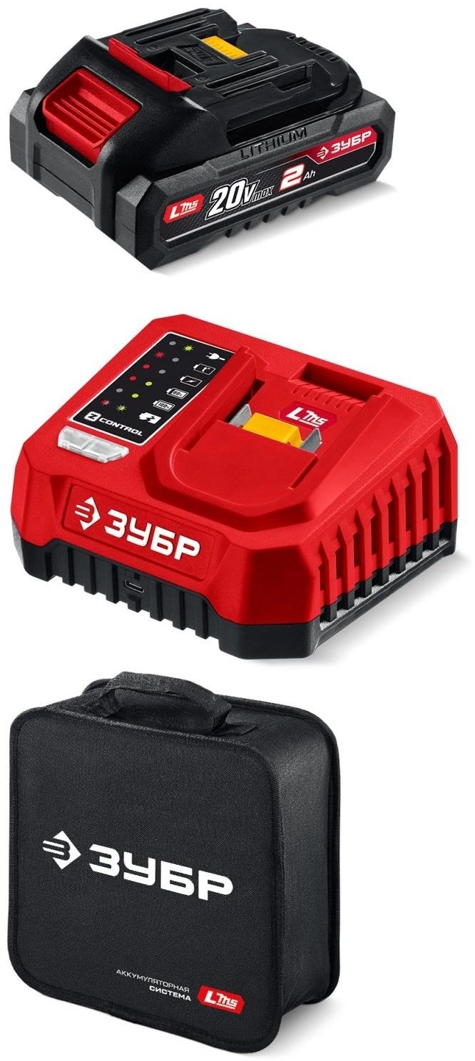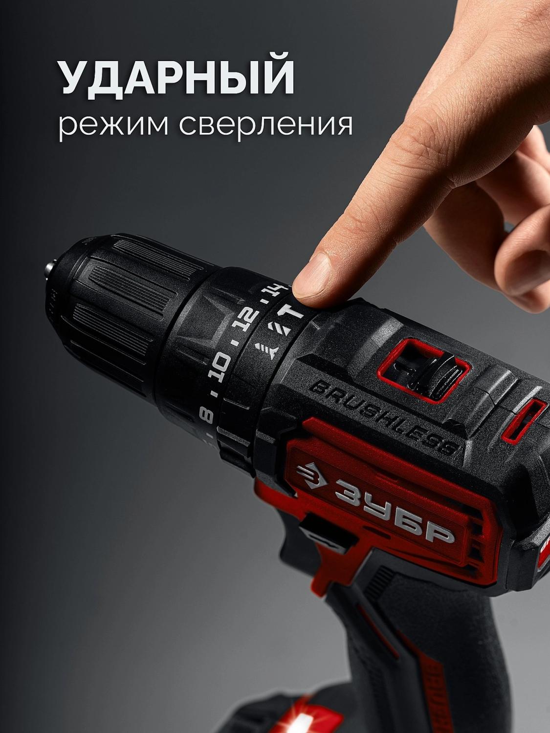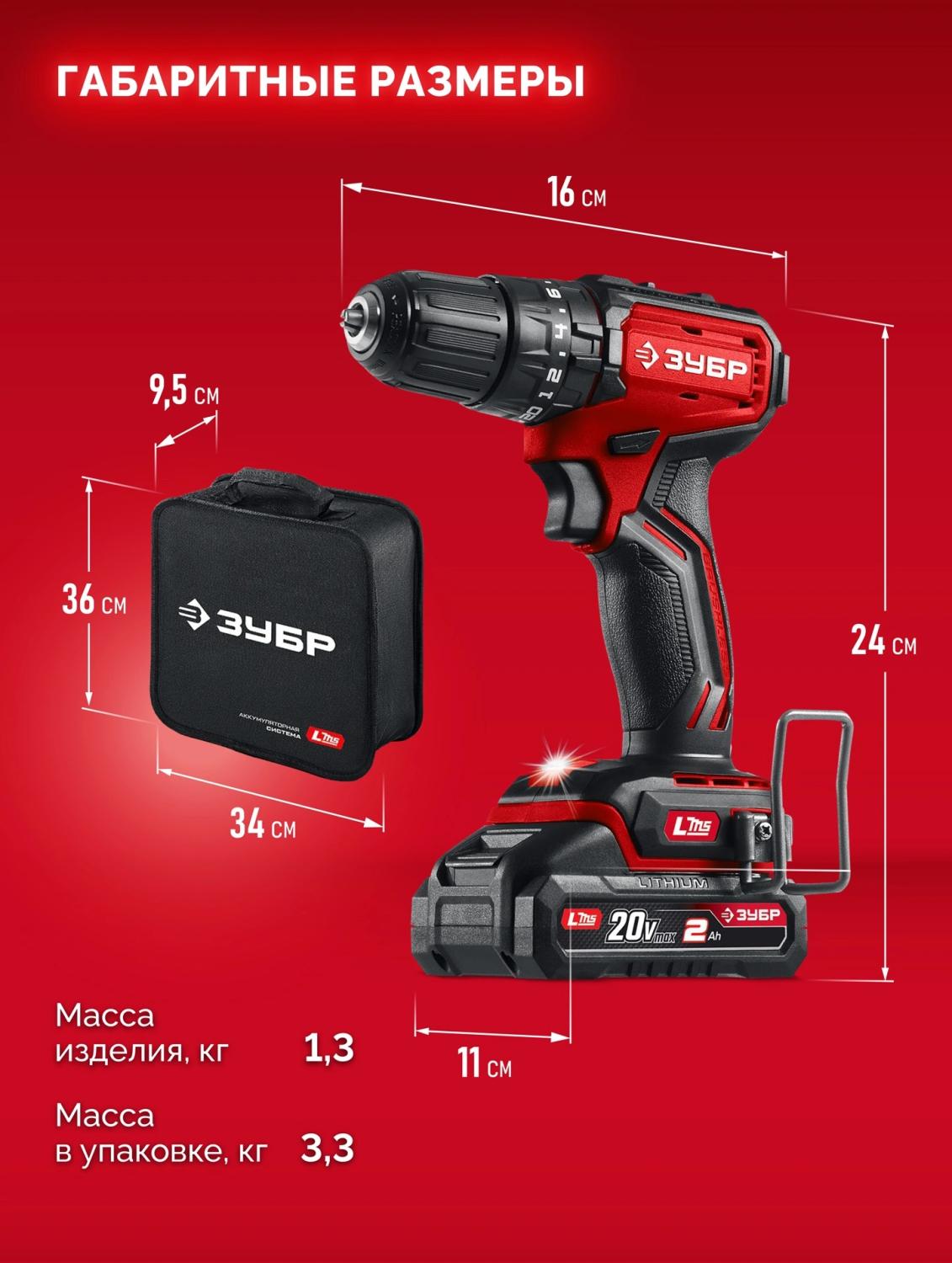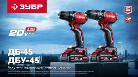 Дрель-шуруповёрт ударная аккумуляторная Зубр бесщёточная 2 АКБ х Li-ion (20 В, 2 Ач)+ЗУ (ДБУ-45-22)<br><br>Бесщёточная дрель-шуруповёрт ударная Зубр обеспечивает как точное заворачивание маленьких саморезов, так и уверенное закручивание крупного крепежа до 8мм. Компактный размер и современный дизайн делают её удобной для работы. Комплектация с аккумулятором позволяет начать работу сразу после покупки.<br><br>Применение<br>Для сверления отверстий в различных материалах (при установке соответствующих свёрл), закручивания/откручивания резьбовых соединений (при установке соответствующих бит),перемешивания ЛКМ (при установке соответствующих насадок)<br><br>Преимущества<br>• Единая аккумуляторная система LMS для 500+ инструментов<br>• Компактная аккумуляторная дрель-шуруповёрт с двигателем Brushless<br>• Аккумулятор универсальной системы LMS повышенной ёмкости 2.0 Аxч позволяет инструменту работать дольше и эффективнее<br>• Бесщёточный Brushless двигатель обладает рядом преимуществ по сравнению с щёточным двигателем:<br>— высокий крутящий момент,<br>— высокий КПД благодаря максимально эффективному преобразованию электромагнитной энергии в механическую (ввиду отсутствия перекоммутаций),<br>— повышенная надёжность ввиду отсутствия искрения, трения и трущихся деталей,<br>— низкое энергопотребление (до 4 раз дольше работа на одном заряде батареи),<br>— высокая степень защиты двигателя благодаря интеллектуальному управлению,<br>— гибкая регулировка крутящего момента и поддержка его на максимальном уровне при любых оборотах,<br>— отсутствие перекоммутаций в коллекторе и, соответственно, отсутствие нагрева и потерь из-за переходных сопротивлений<br>• Высокий крутящий момент при широком диапазоне оборотов благодаря конструкции редуктора<br>• Двухскоростной планетарный редуктор позволяет как заворачивать с большим крутящим моментом, так и сверлить на высоких оборотах<br>• Ударная функция расширяет спектр применения изделия и позволяет сверлить отверстия также в лёгком бетоне<br>• Бесключевой одномуфтовый патрон для максимальной простоты и скорости замены расходного инструмента<br>• Широкий диапазон регулировки крутящего момента превращает изделие в универсальный инструмент: от аккуратного закручивания маленьких винтиков до заворачивания крупных саморезов<br>• Электронный тормоз двигателя для исключения выбега при остановке<br>• Высокотоковое зарядное устройство для быстрой зарядки аккумулятора<br>• Подсветка рабочего места способствует дополнительному удобству при работе в условиях недостаточного освещения<br>• Индикация заряда для контроля состояния батареи<br>• Скоба для крепления на поясе, устанавливаемая с любой стороны инструмента<br>• Реверс<br>• Рукоятка с противоскользящей накладкой<br><br>Комплектация<br>• Дрель-шуруповёрт<br>• Аккумулятор (2 шт)<br>• Зарядное устройство<br>• Бита 50 мм<br>• Скоба поясная<br>• Руководство по эксплуатации<br><br>Базовая гарантия сроком 3 года, при условии только бытового применения. Расширенная гарантия на 5 лет доступна только при условии использования товара в бытовых целях, прохождения периодического обслуживания в авторизованном сервисном центре, при регистрации инструмента на сайте производителя в течение 4-х недель с момента покупки.<br><br>Внешний вид и/или характеристики товара могут быть изменены производит