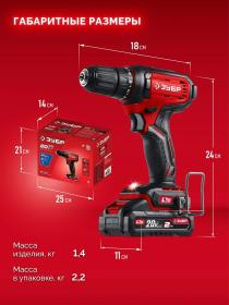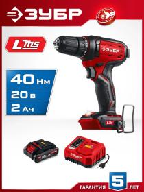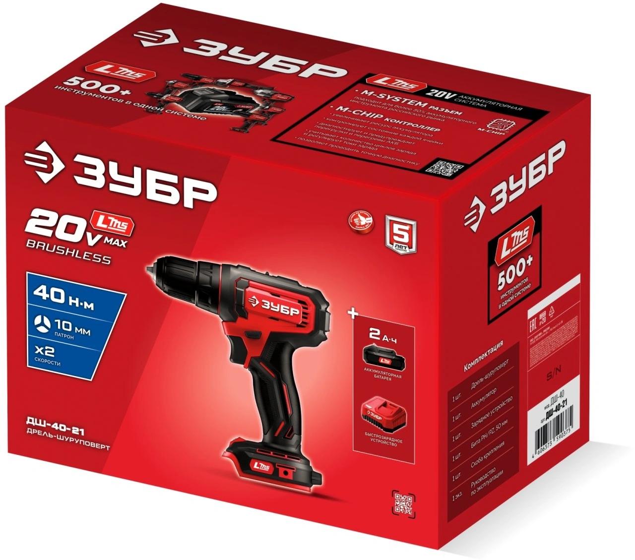 Дрель-шуруповёрт ударная аккумуляторная Зубр АКБ х Li-ion (20 В, 2 Ач)+ЗУ (ДШУ-40-21)<br><br>Компактная и недорогая дрель-шуруповёрт ударная Зубр предназначена для сверления и заворачивания. Эргономичный дизайн, производительный двигатель и настроенная муфта момента позволяет выполнять точный работы легко и без усилий. Комплектация с аккумулятором позволяет начать работу сразу после покупки.<br><br>Применение<br>Для сверления отверстий в различных материалах (при установке соответствующих свёрл), закручивания/откручивания резьбовых соединений (при установке соответствующих бит),перемешивания ЛКМ (при установке соответствующих насадок).<br><br>Преимущества<br>• Единая аккумуляторная система LMS для 500+ инструментов<br>• Компактная аккумуляторная дрель-шуруповёрт для домашних работ<br>• Аккумулятор универсальной системы LMS повышенной ёмкости 2.0 Аxч позволяет инструменту работать дольше и эффективнее<br>• Высокий крутящий момент при широком диапазоне оборотов благодаря конструкции редуктора<br>• Ударная функция расширяет спектр применения изделия и позволяет сверлить отверстия также в лёгком бетоне<br>• Литий-ионная технология аккумуляторной батареи:<br>— максимальное напряжение заряженной батареи достигает 20В,<br>— высокая производительность,<br>— электронная система защиты от перегрузки, перегрева и глубокой разрядки,<br>— отсутствие эффекта памяти,<br>— отсутствие потери мощности в процессе работы<br>• Бесключевой одномуфтовый патрон для максимальной простоты и скорости замены расходного инструмента<br>• Двухскоростной планетарный редуктор позволяет как заворачивать с большим крутящим моментом, так и сверлить на высоких оборотах<br>• Широкий диапазон регулировки крутящего момента превращает изделие в универсальный инструмент: от аккуратного закручивания маленьких винтиков (минимальный момент 0,2 Нм) до заворачивания крупных саморезов<br>• Возможность быстрой смены биты благодаря блокировке шпинделя<br>• Электронный тормоз двигателя для исключения выбега при остановке<br>• Высокотоковое зарядное устройство для быстрой зарядки аккумулятора<br>• Подсветка рабочего места способствует дополнительному удобству при работе в условиях недостаточного освещения<br>• Индикация заряда для контроля состояния батареи<br>• Реверс<br>• Рукоятка с противоскользящей накладкой для удобного и надёжного хвата<br><br>Комплектация<br>• Дрель-шуруповёрт<br>• Аккумулятор<br>• Зарядное устройство<br>• Бита 50 мм<br>• Скоба поясная<br>• Руководство по эксплуатации<br><br>Базовая гарантия сроком 3 года, при условии только бытового применения. Расширенная гарантия на 5 лет доступна только при условии использования товара в бытовых целях, прохождения периодического обслуживания в авторизованном сервисном центре, при регистрации инструмента на сайте производителя в течение 4-х недель с момента покупки.<br><br>Внешний вид и/или характеристики товара могут быть изменены производителем в соответствии с производственным процессом.