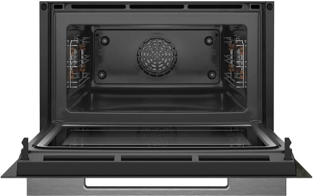 Функция позволяет управлять Bosch CMG7241W1 удаленно с помощью смартфона. Во время работы прибора температура дверцы не превышает 30°С. Очистка камеры — паровая. За безопасность отвечают блокировка управляющего модуля и автоматическое отключение при долгой работе.