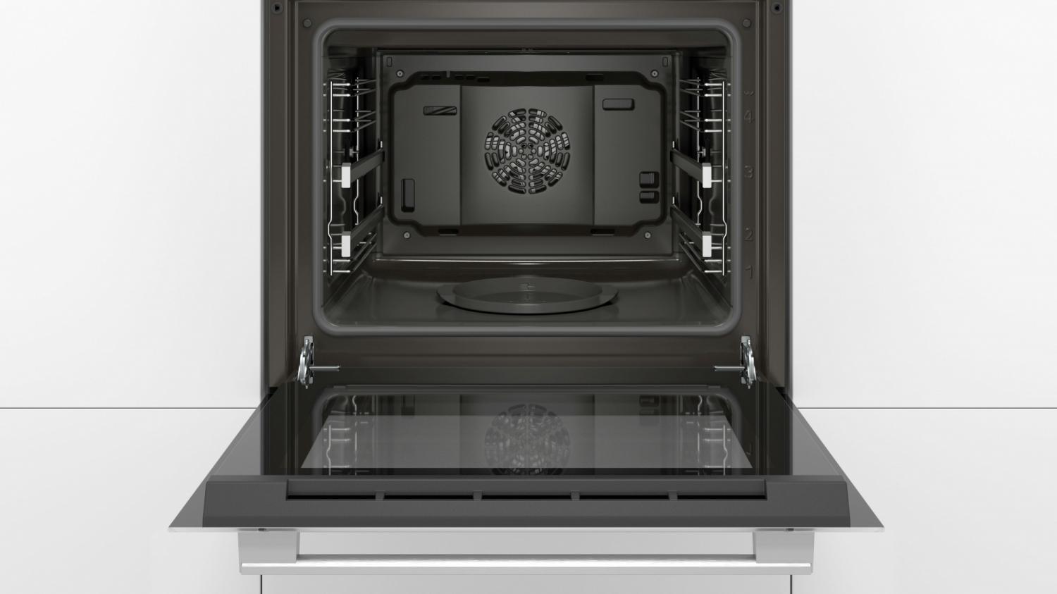 В конструкции духового шкафа используется специальный амортизатор, который плавно закрывает дверь духовки без лишнего шума. Никаких усилий, просто чуть подтолкнуть дверь и она сама приостановится перед закрытием, а затем закроется мягко и тихо.