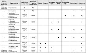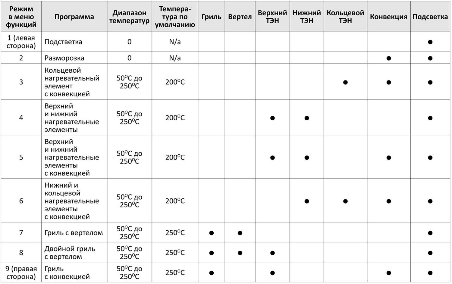 | Режимы духовки | Подсветка, Разморозка, Кольцевой нагревательный элемент с конвекцией, Верхний и нижний нагревательный элементы, Верхний и нижний нагревательный элементы с конвекцией, Нижний и кольцевой нагревательный элемент с конвекцией, Гриль с вертелом, Двойной гриль с вертелом, Гриль с конвекцией |