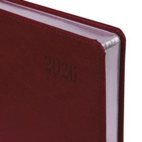 Твердая обложка стилизована под гладкую кожу благородного бордового цвета. Материал обложки подходит для горячего тиснения. Серебряный срез придает ежедневнику особый шарм. Дополнением является закладка-ляссе, с помощью которой при необходимости можно быстро открыть ежедневник на нужной странице. Ежедневник снабжен обширным справочным материалом. В конце имеются 4 страницы для записей и заметок.