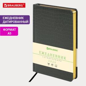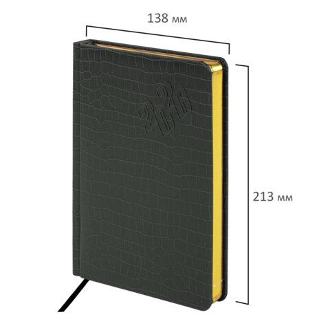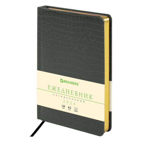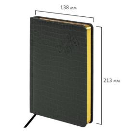 Датированный ежедневник BRAUBERG "Comodo" с обложкой, стилизованной под кожу крокодила, выглядит очень изысканным.Внутренний блок включает 168 листов тонированной бумаги плотностью 70 г/м2. Каждая страничка имеет перфорированный угол. Благодаря стандартному формату А5 (138х213 мм) ежедневник удобно использовать как в офисе, так и на выездных деловых встречах. Материал обложки благородного серого-зеленого цвета подходит для горячего тиснения. Срез ежедневника фольгирован золотой фольгой, что придает ему особый шарм.