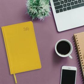 Твердая обложка стилизована под гладкую кожу яркого желтого цвета. Подходит для горячего тиснения. Срез и форзац ежедневника окрашены на контрасте с цветом обложки, что придает ему особый шарм. Дополнением является закладка-ляссе, с помощью которой при необходимости можно быстро открыть ежедневник на нужной странице. Помимо прочего, ежедневник снабжен обширным справочным материалом. В конце имеются 4 страницы для записей и заметок.
