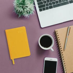 Имеет приятную на ощупь обложку желтого цвета с гладкой матовой поверхностью. Жесткая книжная обложка с легкой рельефной фактурой напоминает натуральную кожу. Материал обложки – балакрон, подходит для тиснения только фольгой. Дополнением является закладка-ляссе, с помощью которой при необходимости можно быстро открыть ежедневник на нужной странице. Помимо прочего, ежедневник снабжен обширным справочным материалом. В конце имеются 4 страницы для записей и заметок.