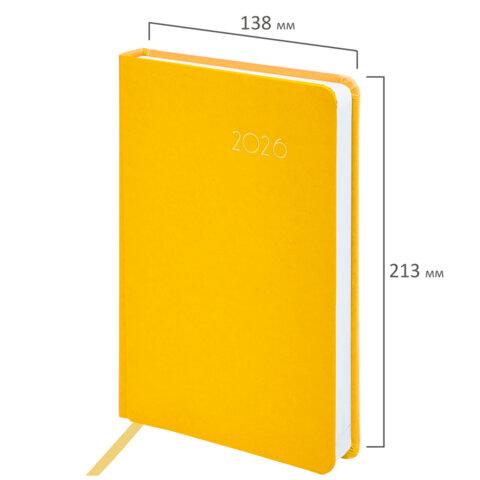 Жесткая книжная обложка желтого цвета с легкой рельефной фактурой напоминает натуральную кожу. Материал обложки – балакрон, подходит для тиснения только фольгой. Дополнением является закладка-ляссе, с помощью которой при необходимости можно быстро открыть ежедневник на нужной странице. Обширный справочный материал дополнительно расширяет функциональность ежедневника. В конце внутреннего блока есть 4 страницы для записей и заметок.