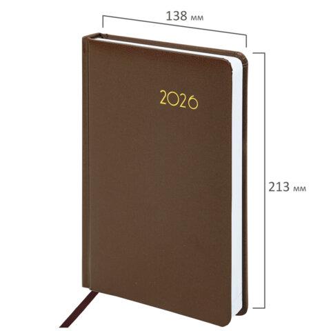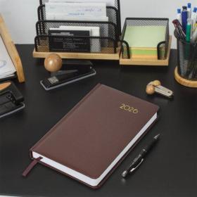 Жесткая книжная обложка благородного коричневого цвета с легкой рельефной фактурой напоминает натуральную кожу. Материал обложки – балакрон, подходит для тиснения только фольгой. Дополнением является закладка-ляссе, с помощью которой при необходимости можно быстро открыть ежедневник на нужной странице. Помимо прочего, ежедневник снабжен обширным справочным материалом. В конце имеются 4 страницы для записей и заметок.