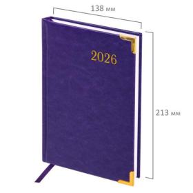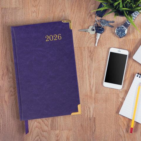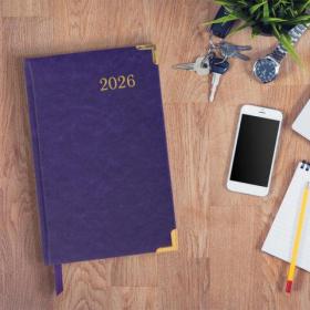 Твердая обложка фиолетового цвета, стилизованная под гладкую кожу. Подходит для горячего тиснения. Ежедневник имеет металлические уголки, что придает ему особый шарм. Дополнением является закладка-ляссе, с помощью которой при необходимости можно быстро открыть ежедневник на нужной странице. Помимо прочего, ежедневник снабжен обширным справочным материалом. В конце имеются 4 страницы для записей и заметок.