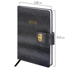 Твердая обложка стилизована под текстурную кожу. Материал обложки подходит для горячего тиснения. Дополнением является закладка-ляссе, с помощью которой при необходимости можно быстро открыть ежедневник на нужной странице. Ежедневник фиксируется стильной металлической застежкой, поэтому он не откроется в сумке или портфеле и страницы не помнутся. Ежедневник снабжен обширным справочным материалом. В конце имеются 4 страницы для записей и заметок.