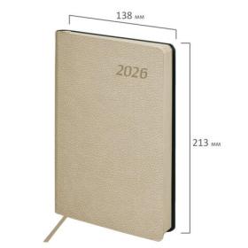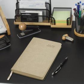 Мягкая (интегральная) обложка стилизована под фактурную кожу бежевого цвета. Подходит для горячего тиснения. Дополнением является закладка-ляссе, с помощью которой при необходимости можно быстро открыть ежедневник на нужной странице. Ежедневник снабжен справочным материалом. В конце имеются 4 страницы для записей и заметок.