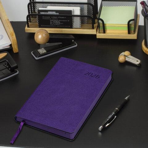 Мягкая (интегральная) обложка стилизована под фактурную кожу яркого фиолетового цвета. Подходит для горячего тиснения. Дополнением является закладка-ляссе, с помощью которой при необходимости можно быстро открыть ежедневник на нужной странице. Ежедневник снабжен справочным материалом. В конце имеются 4 страницы для записей и заметок.