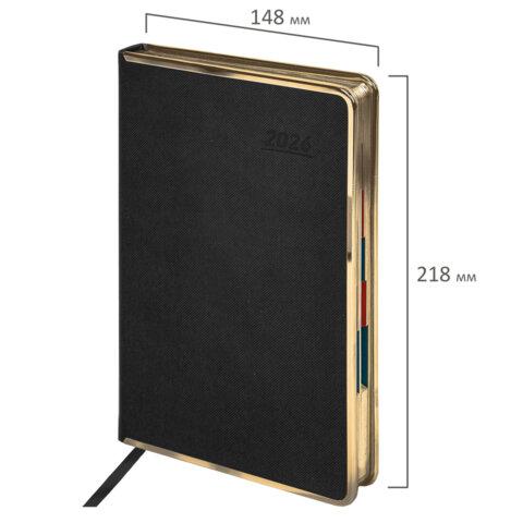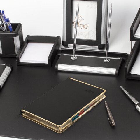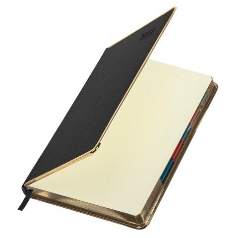 Датированный ежедневник серии "Infinity" от GALANT – надежный спутник делового человека.Внутренний блок включает 168 листов тонированной бумаги цвета "слоновая кость" плотностью 70 г/м2. Каждая страничка имеет перфорированный угол. Благодаря стандартному формату А5 (148х218 мм) ежедневник удобно использовать как в офисе, так и на выездных деловых встречах.Твердая обложка выполнена под кожу с отделкой из металлических накладок, что увеличивает ее износоустойчивость. Срез ежедневника покрыт золотой фольгой в цвет металлических накладок, и это придает ему особый шарм. Материал обложки подходит для горячего тиснения.