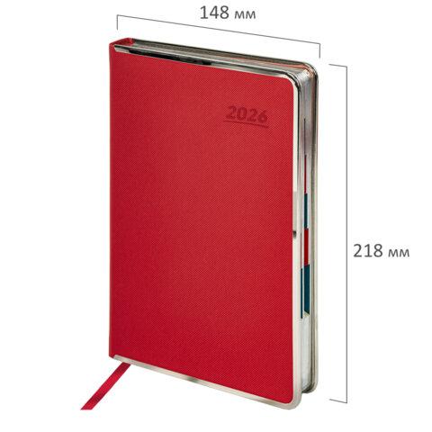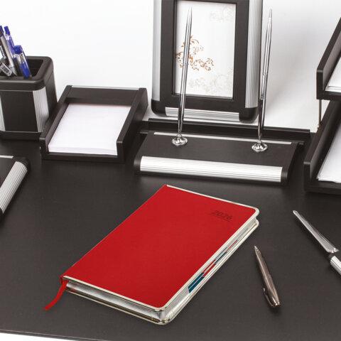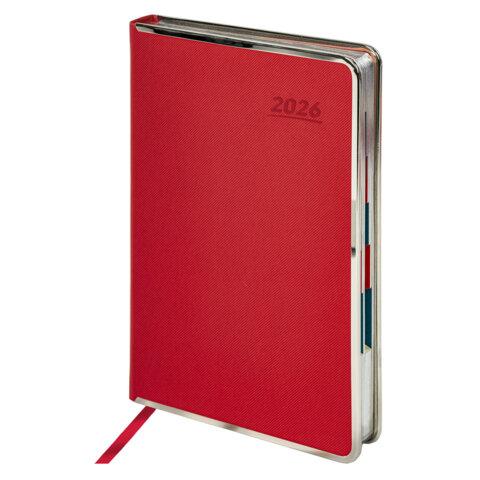 Дополнением является закладка-ляссе, с помощью которой при необходимости можно быстро открыть ежедневник на нужной странице, а также вырубка по месяцам. Помимо прочего, ежедневник снабжен обширным справочным материалом. В конце ежедневника есть 6 страниц для записей и заметок. Выполнен в красном цвете.