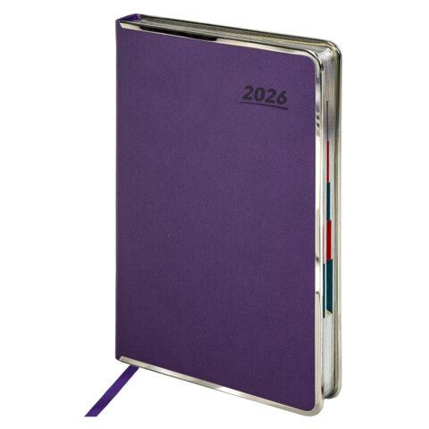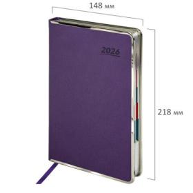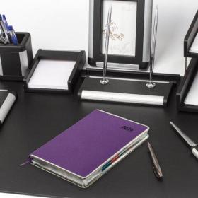 Дополнением является закладка-ляссе, с помощью которой при необходимости можно быстро открыть ежедневник на нужной странице, а также вырубка по месяцам. Помимо прочего, ежедневник снабжен обширным справочным материалом. В конце ежедневника есть 6 страниц для записей и заметок. Выполнен в фиолетовом цвете.