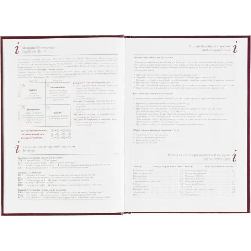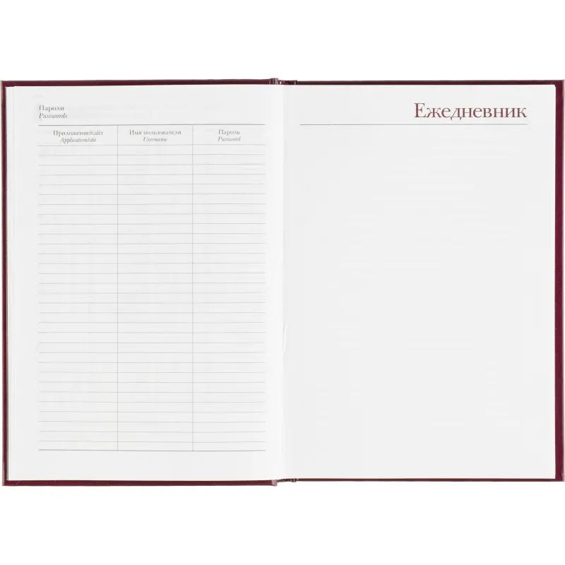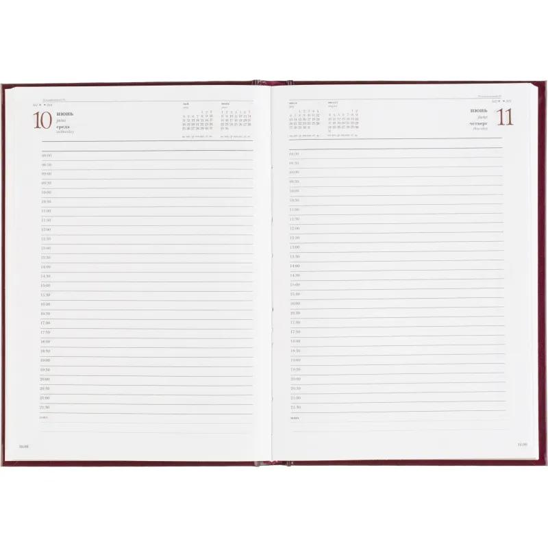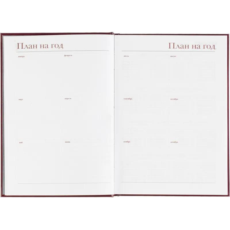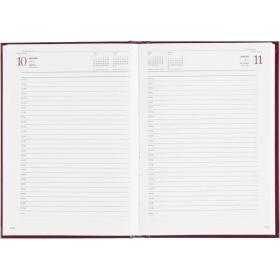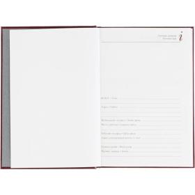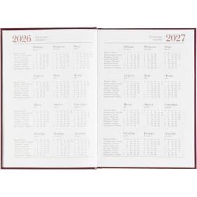 Ежедневник датированный Attache Ideal New предназначен для структурирования задач и планирования дел на каждый день. Модель выполнена в формате A5 и имеет размер 14.6×20.6 см, что делает её удобной для повседневного использования. Обложка из балакрона бордового цвета оформлена в однотонном деловом стиле. Материал устойчив к истиранию и сохраняет аккуратный внешний вид даже при активной эксплуатации. Твёрдая основа и вертикальная ориентация обеспечивают удобство при работе с записями.<br><br>Внутренний блок содержит 168 листов белой офсетной бумаги плотностью 60 г/кв.м, с линейной разметкой и печатью в две краски. Страницы соединены сшивкой, что повышает надёжность крепления. В ежедневнике предусмотрена датированная разметка на 2026 год, а также календарный блок на 2 года. Листы не имеют скруглённых углов, перфорации и вырубки.