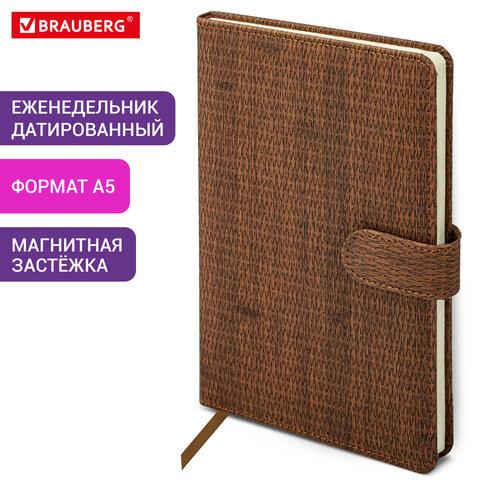 Еженедельники серии "Augustus" от BRAUBERG обладают особым шармом и неповторимой изысканностью, а насыщенные цвета придают аксессуарам неподдельный шик.Внутренний блок включает 64 листа тонированной бумаги плотностью 70 г/м2. Благодаря стандартному формату А5 (145х215 мм) еженедельник удобно использовать как в офисе, так и на выездных деловых встречах. Твердая обложка, стилизованная под кожу с текстурной выработкой, фиксируется магнитной застежкой, поэтому еженедельник не откроется в сумке или портфеле и страницы не помнутся. Подходит для горячего тиснения. Дополнением является закладка-ляссе, с помощью которой при необходимости можно быстро открыть еженедельник на нужной странице. Для заметок в еженедельнике имеется 7 страниц в конце внутреннего блока. Помимо прочего, еженедельник снабжен обширным справочным материалом. Выполнен в благородном коричневом цвете.