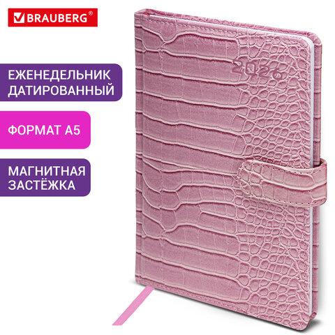 Еженедельник BRAUBERG "Party" – это аксессуар для неординарных людей. Сочные цвета и выраженная текстура выгодно дополнены магнитной застежкой. Дизайн, выполненный под крокодиловую кожу, станет эффектным дополнением к офисному образу.Внутренний блок включает 64 листа белой бумаги плотностью 70 г/м2. Благодаря стандартному формату А5 еженедельник удобно использовать как в офисе, так и на выездных деловых встречах. Твердая обложка, стилизованная под кожу крокодила, фиксируется магнитной застежкой, поэтому еженедельник не откроется в сумке или портфеле и страницы не помнутся. Подходит для горячего тиснения. Дополнением является закладка-ляссе, с помощью которой при необходимости можно быстро открыть еженедельник на нужной странице. Для заметок в еженедельнике имеется 7 страниц в конце внутреннего блока. Еженедельник снабжен обширным справочным материалом. Выполнен в коралловом цвете.