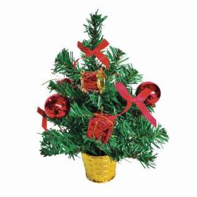 Ель искусственная декоративная ЗОЛОТАЯ СКАЗКА станет прекрасным украшением для дома или офиса, преобразит пространство, а также подарит праздник и новогоднее настроение.В комплект декоративной ели входят украшения красного цвета: красные шары, банты, имитация подарочных коробок. Материал хвои - ПВХ. Тип крепления ветвей – примотка. Данный способ крепления предполагает, что после покупки ели необходимо самостоятельно расправить веточки для того, чтобы ель приобрела нужную форму. Высота ели - 30 см (включая подставку в форме декоративного горшка золотистого цвета), диаметр нижнего яруса - 20 см.