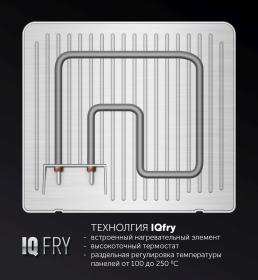 | Описание | Технология IQfry встроенный в панель нагревательный элемент. Высокоточный термостат. Раздельная, плавная регулировка температуры верхней и нижней панелей. Возможность использования в открытом положении. Рабочие поверхности раскрываются на 180°. |