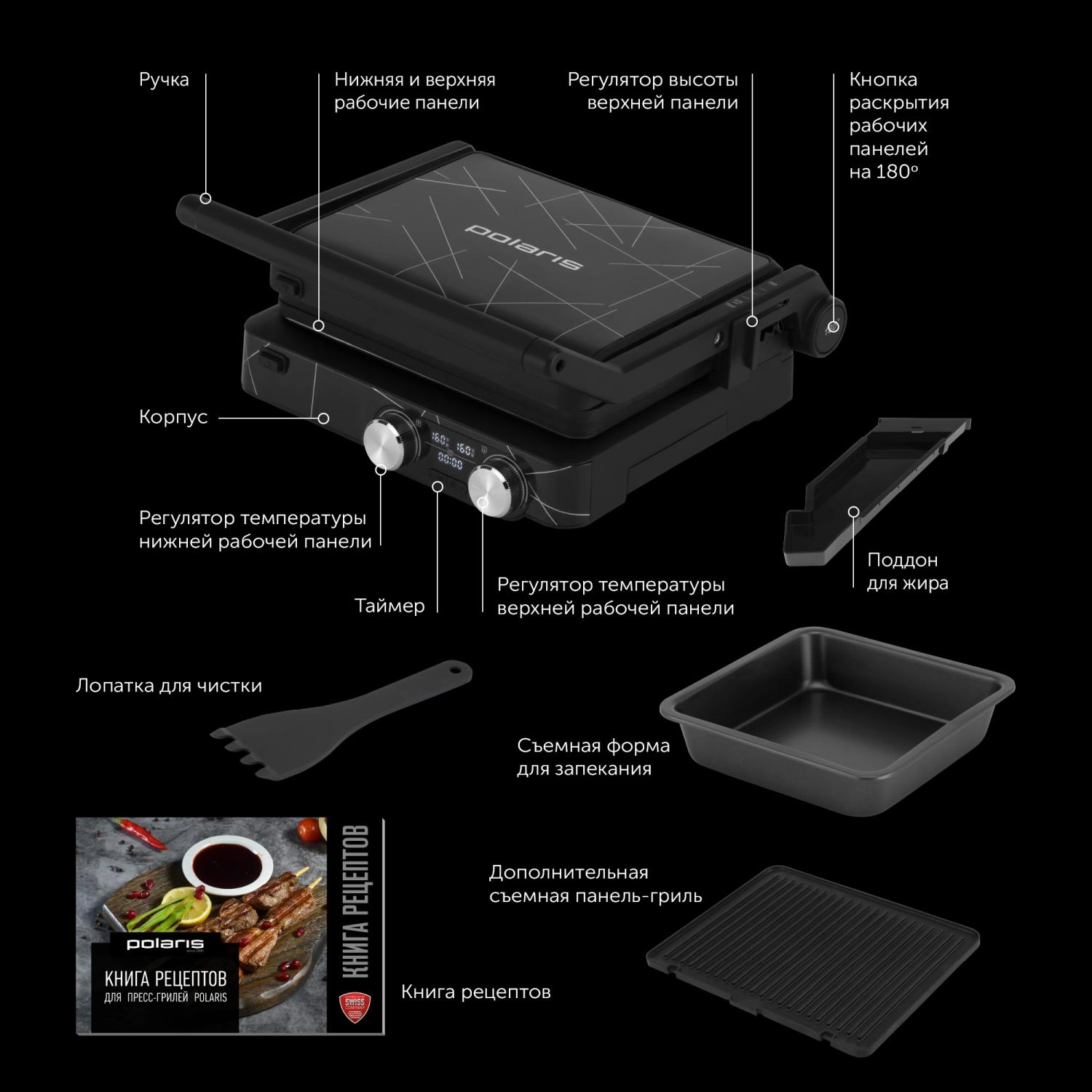 | Принадлежности в комплекте | 3 панели, поддон, лопатка для очистки панелей, съемная форма для запекания, дополнительная панель гриль, книга рецептов |