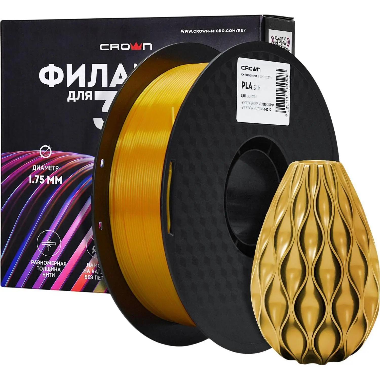 Пластик PLA для 3D-принтера Crown Micro золотой 1.75 мм 1 кг<br><br>Пластик PLA для 3D-печати обладает биоразлагаемыми свойствами и экологической безопасностью. Золотой филамент диаметром 1.75 мм обеспечивает точную и равномерную подачу материала, позволяя создавать детализированные и глянцевые изделия с металлическим блеском.<br><br>Рекомендуемая температура печати составляет 190°C, подогрев платформы — 50°C, что способствует хорошему сцеплению с поверхностью и снижает риск деформации деталей. Длина нити равна 330 м, что позволяет выполнять крупные проекты без частой замены катушки. Вес пластика — 1 кг, общий вес с упаковкой — 1.3 кг.<br><br>Внешний вид и/или характеристики товара могут быть изменены производителем в соответствии с производственным процессом.