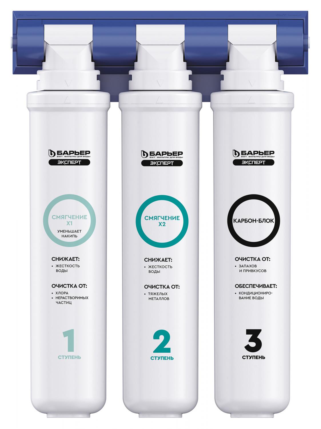 1 ступень — БАРЬЕР ЭКСПЕРТ Смягчение X1. Сочетание сорбционной и механической очистки, предварительное умягчение. Удаляет соли жесткости, тяжелые металлы, соединения хлора и механические частицы.