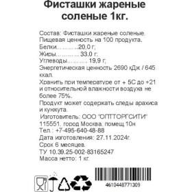 Фисташки жареные соленые — орехи, отличающиеся богатым вкусом и полезными питательными веществами. Фисташки содержат витамины и минералы, чрезвычайно полезные для здоровья, например, белок, жиры, витамины группы В, магний, железо, калий. При этом данный продукт является бесценным источником энергии, дающим силу и бодрость на целый день! Фисташки станут идеальным украшением любого чаепития, они также активно используются в кулинарии, например, в выпечке или при приготовлении кондитерских изделий. Регулярное употребление фисташек — это здоровье и энергия на каждый день! В упаковке 1 килограмм обжаренных фисташек с добавлением соли. <br /> Состав: фисташки, соль. <br /> Пищевая ценность на 100 г: белки — 24 г, жиры — 42.17 г, углеводы — 34.27 г. <br /> Энергетическая ценность на 100 г: 598 ккал. <br /> Срок годности: 12 месяцев. <br /> Условия хранения: от 5 до 25 С. <br /> Страна производства: Россия.