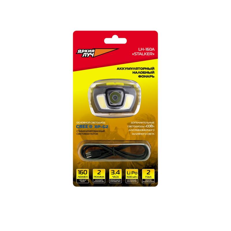 Фонарь налобный светодиодный Яркий Луч LH-160A Stalker CREE XP-G2 аккумуляторный (4606400105855)<br><br>Фонарь налобный оснащён современным светодиодом CREE XP-G2 и дополнительными COB-светодиодами, обеспечивающими дальний и ближний свет. Максимальный световой поток достигает 160 лм, дальность освещения — до 100 м. Цветовая температура — 5000 К, нейтральный белый свет комфортен для глаз.<br><br>Фонарь поддерживает четыре режима работы: ближний и дальний свет с яркостью 60 и 160 лм. Реализованы функции стабилизации яркости и плавного диммирования. Время автономной работы составляет до 3.5 часов в максимальном режиме.<br><br>Питание осуществляется от встроенного литий-полимерного аккумулятора ёмкостью 1.5 Ач. Зарядка производится через порт micro-USB, USB-кабель входит в комплект. Предусмотрен индикатор заряда.<br><br>Корпус выполнен из ударопрочного пластика чёрного цвета с влагозащитой. Размер фонаря — 66×45.5×37.5 мм, вес — 83 г.<br><br>Гарантийный срок — 24 месяца.<br><br>Внешний вид и/или характеристики товара могут быть изменены производителем в соответствии с производственным процессом.