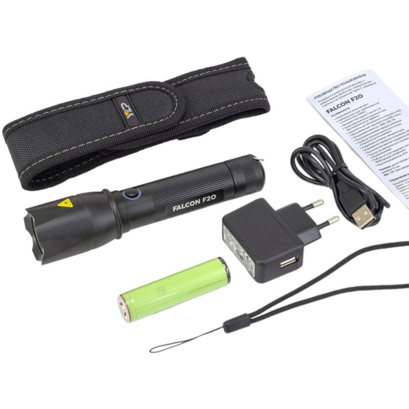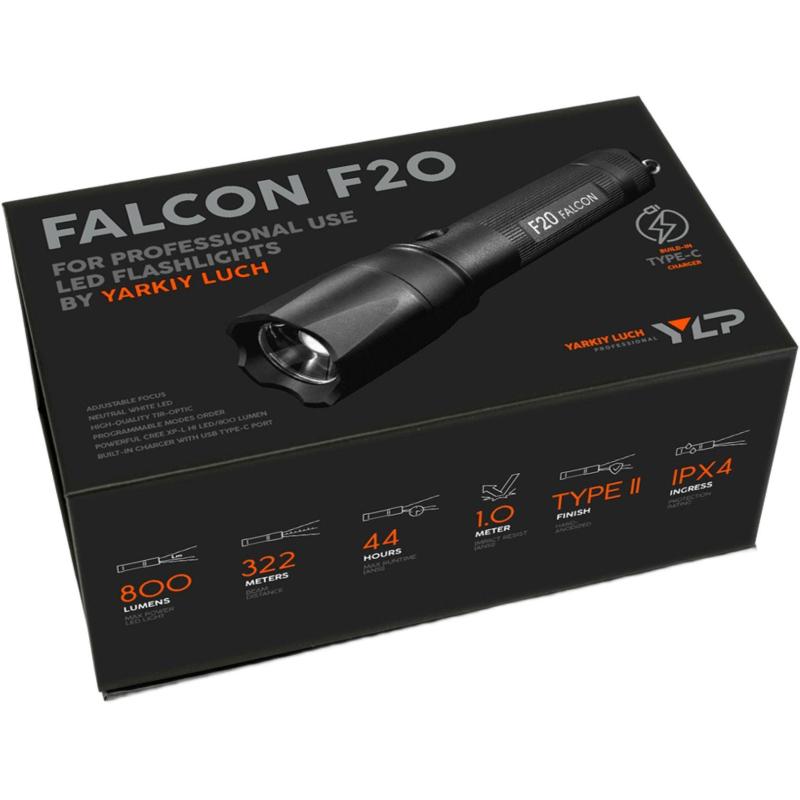 Фонарь ручной светодиодный Яркий луч F20 Falcon Cree XP-L HI аккумуляторный (4606400105404)<br><br>Ручной фонарь с корпусом из анодированного металла чёрного цвета оснащён одним светодиодом Cree XP-L HI мощностью 10 Вт. Он излучает нейтральный белый свет с цветовой температурой 4200 К и световым потоком 800 лм. Луч достигает дальности 322 м. Фонарь работает в трёх режимах — 100%, 30% и 5%, предусмотрена стабилизация яркости и память режимов.<br><br>Система TIR-оптики обеспечивает регулируемую фокусировку без туннельного эффекта и потерь света: можно выбрать широкий ближний или узкий дальний луч. Порядок режимов программируется, а переключение осуществляется боковой кнопкой. На корпусе предусмотрен USB-разъём с защитой от загрязнений и индикатор заряда. Конструкция влагозащищённая (IPX4) и ударопрочная.<br><br>Устройство питается от аккумулятора формата 18650 ёмкостью 3.4 Ач, который входит в комплект. Максимальное время автономной работы составляет до 44 часов. В комплект также входят чехол, темляк, зарядный кабель и сетевой адаптер. Размер фонаря — 16×8.5×8.5 см, вес — 159 г. Фонарь подойдёт для повседневного использования и работы в сложных условиях, обеспечивая как ближний, так и дальний свет.<br><br>Внешний вид и/или характеристики товара могут быть изменены производителем в соответствии с производственным процессом.