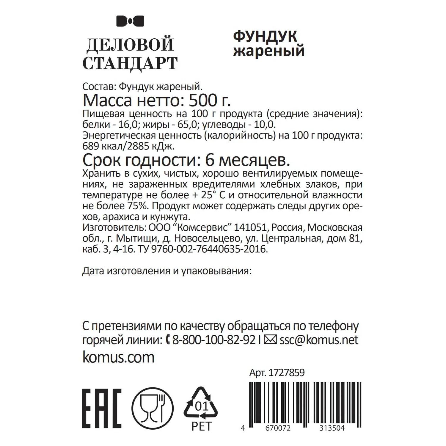 Фундук жареный Деловой Стандарт тщательно отбирается по калибру и готов к употреблению. Ядра фундука дополнят привычный рацион, станут полезной добавкой к различным блюдам и кондитерским изделиям или основой для ореховых паст и батончиков. Фундук является одним из любимых продуктов спортсменов, веганов и приверженцев здорового образа жизни. Высокое содержание растительного белка, витаминов, минералов, железа, магния, калия, кальция позволяют назвать фундук действительно полезным продуктом.<br>Состав: фундук жареный, ядро.<br>Пищевая ценность: белки — 16 г, жиры — 65 г, углеводы — 10 г.<br>Энергетическая ценность: 689 ккал/2883 кДж. <br>Срок годности: 180 дней. <br>Условия хранения: от +5 до +25 градусов С и относительной влажности не более 75%.<br>Вес: 500 г.<br>Страна производства: Россия.