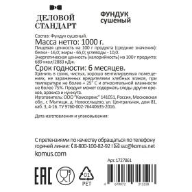 Фундук сушеный Деловой Стандарт тщательно отбирается по калибру и готов к употреблению. Ядра фундука дополнят привычный рацион, станут полезной добавкой к различным блюдам и кондитерским изделиям или основой для ореховых паст и батончиков. Фундук является одним из любимых продуктов спортсменов, веганов и приверженцев здорового образа жизни. Высокое содержание растительного белка, витаминов, минералов, железа, магния, калия, кальция позволяют назвать фундук действительно полезным продуктом.<br>Состав: фундук сушеный, ядро.<br>Пищевая ценность: белки — 16 г, жиры — 65 г, углеводы — 10 г. <br>Энергетическая ценность: 689 ккал/2883 кДж.<br>Срок годности: 180 дней. <br>Условия хранения: от +5 до +25 градусов С и относительной влажности не более 75%.<br>Вес: 1000 г. <br>Страна производства: Россия.