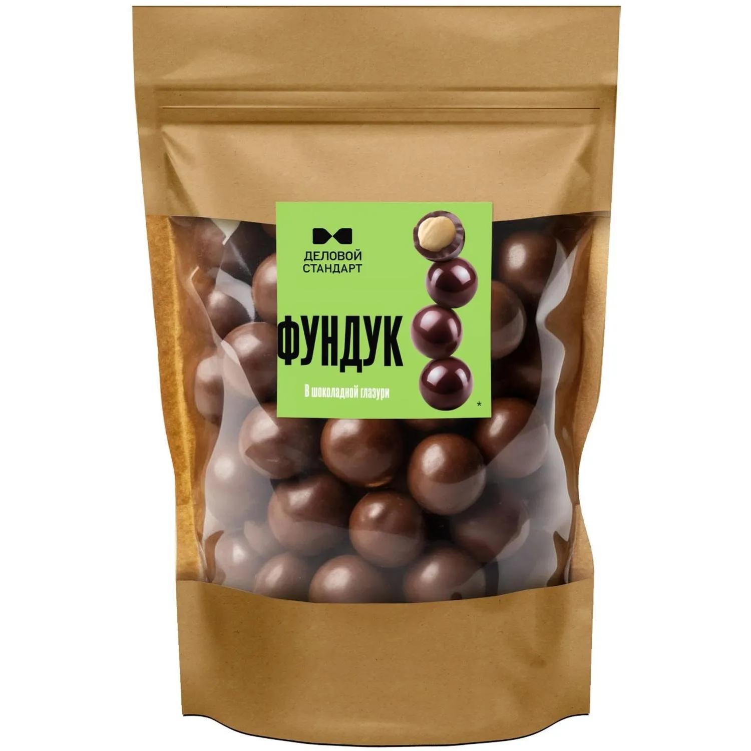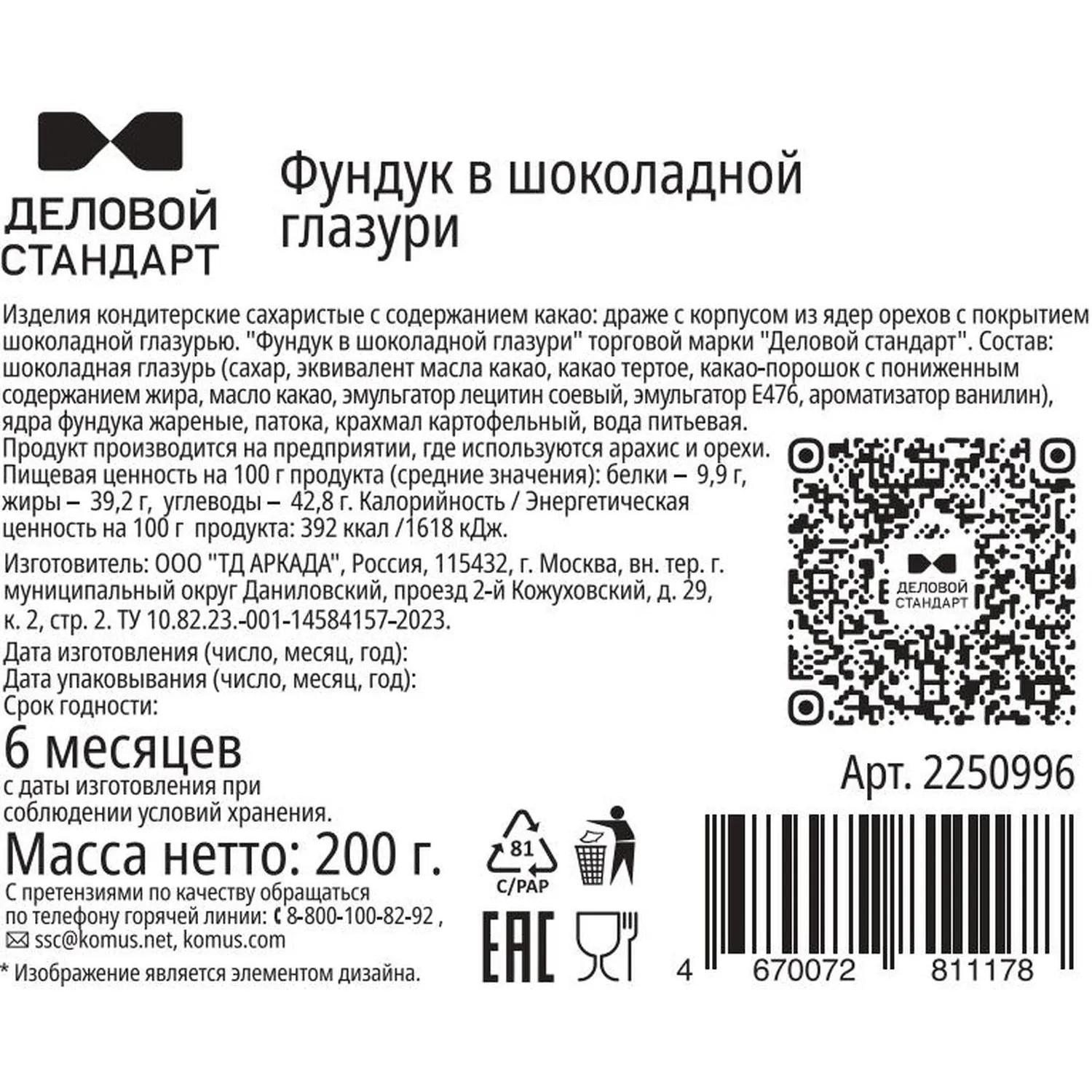 Фундук Деловой Стандарт в шоколадной глазури жареный 200 г<br /> <br /> Изысканное лакомство для настоящих гурманов. Откройте для себя неповторимый вкус хрустящего жареного фундука, окунутого в насыщенную шоколадную глазурь. Каждая горсть — это идеальное сочетание ароматных орехов и нежного шоколада, которое подарит вам удовольствие и заряд бодрости на весь день.<br /> <br /> Состав: шоколадная глазурь (сахар, эквивалент масла какао, какао тёртое, какао-порошок с пониженным содержанием жира, масло какао, эмульгатор лецитин соевый, эмульгатор Е476, ароматизатор ванилин), ядра фундука жареные, патока, крахмал картофельный, вода питьевая.<br /> Продукт производится на предприятии, где используются арахис и орехи.<br /> <br /> Пищевая ценность на 100 г продукта (средние значения): белки — 9,9 г, жиры — 39,2 г, углеводы — 42,8 г. <br /> Калорийность / Энергетическая ценность на 100 г продукта: 392 ккал / 1618 кДж.<br /> Хранить при температуре не выше +25 ℃ и относительной влажности воздуха не более 75 %.<br /> <br /> ТУ 10.82.23.-001-14584157-2023.<br /> Срок годности: 6 месяцев с даты изготовления.<br /> Масса нетто: 200 г.<br /> <br /> Внешний вид и/или характеристики товара могут быть изменены производителем в соответствии с производственным процессом.