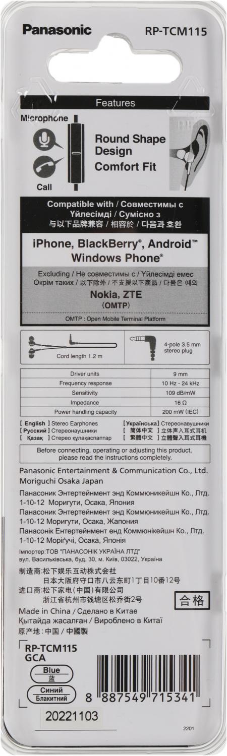 Гарнитура внутриканальные Panasonic RP-TCM115GC 1.2м синий проводные в ушной раковине (RP-TCM115GCA) / 4dealer.ru