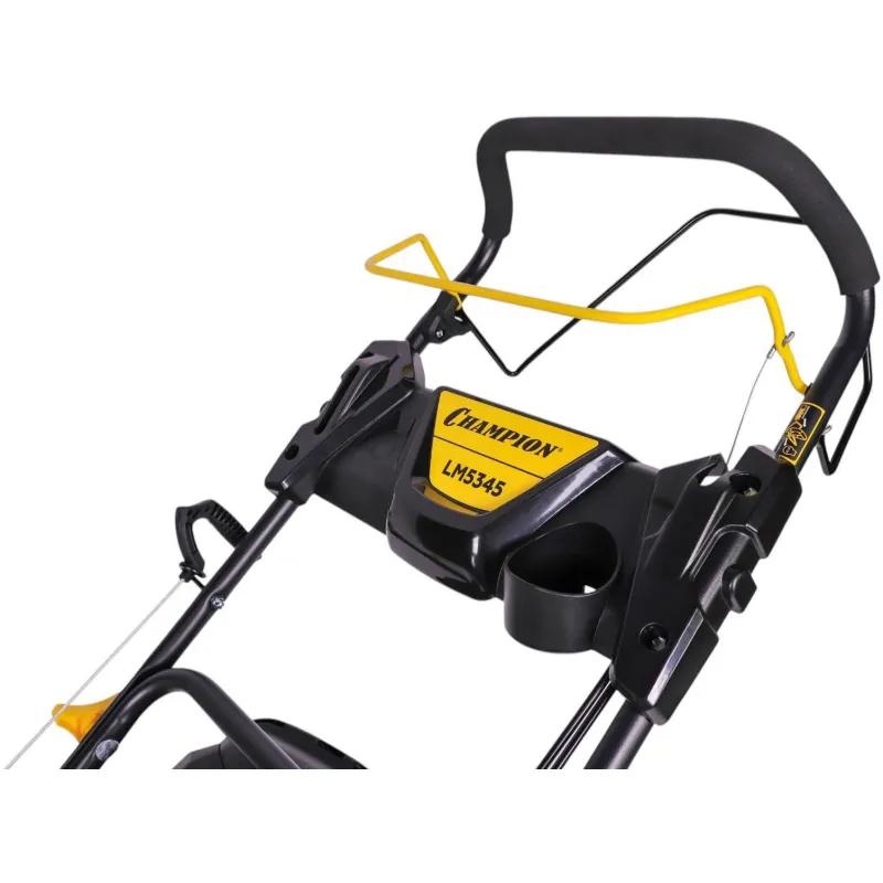 Газонокосилка бензиновая Champion LM5345<br><br>Газонокосилка Champion LM5345 представляет собой производительный агрегат для ухода за большими по площади газонами. Она имеет 3 режима работы: сбор отходов в травосборник, боковой/задний выброс и мульчирование (измельчение) для дальнейшего удобрения почвы. Регулировать высоту кошения можно с помощью центрального рычага в диапазоне 25-75 мм. Широкий профиль колёс не оставляет следов на только что скошенном участке газона.<br><br>Комплектация<br>• Газонокосилка;<br>• Травосборник;<br>• Быстросъёмный штуцер для промывки деки.<br><br>Внешний вид и/или характеристики товара могут быть изменены производителем в соответствии с производственным процессом.