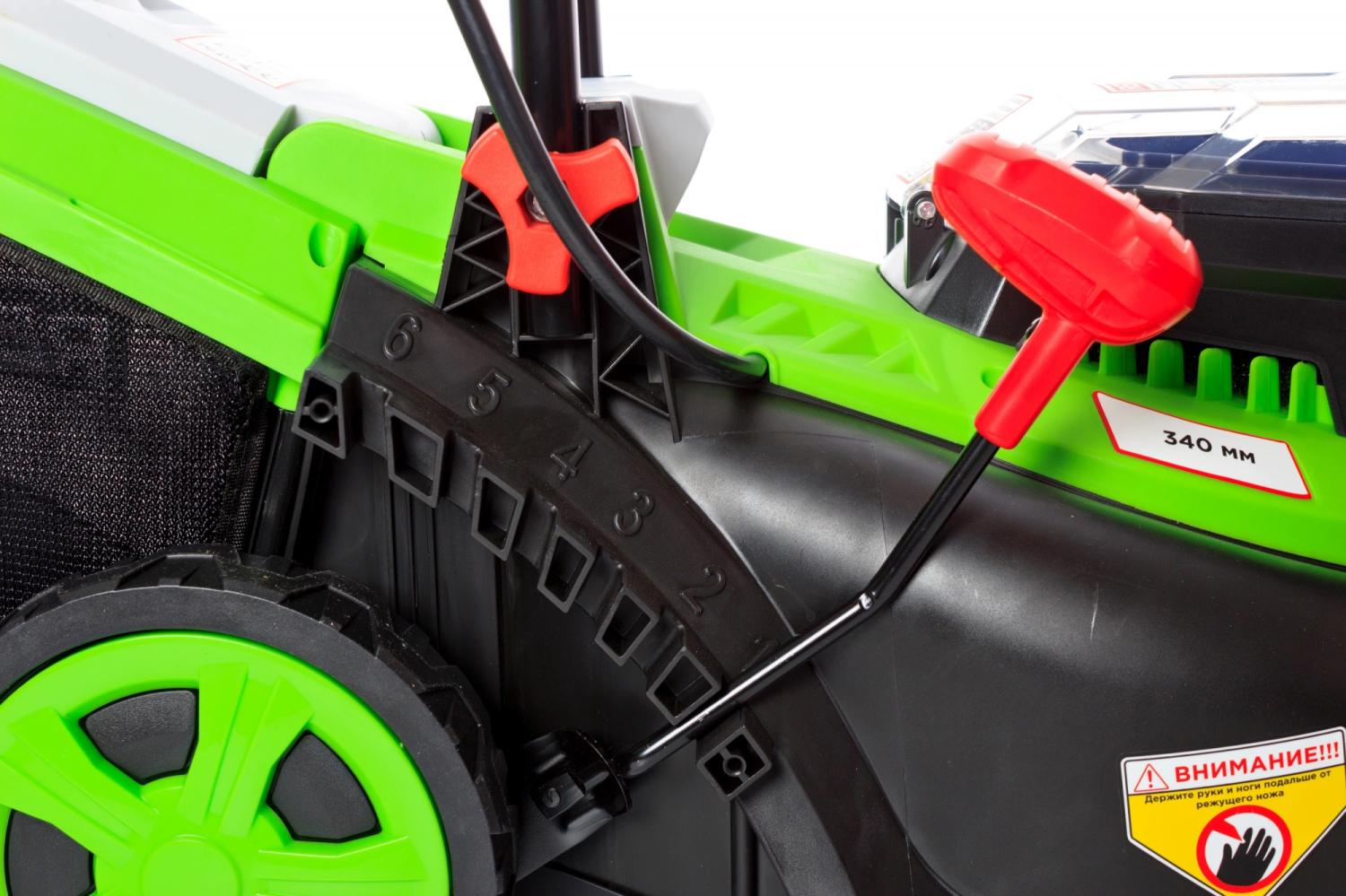 | Особенности устройства | индикатор заполнения травосборника, регулировка высоты скашивания |