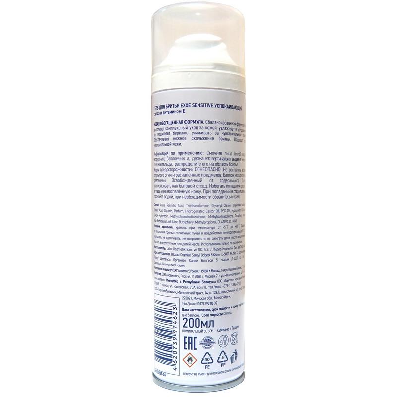 Гель для бритья успокаивающий 200мл EXXE SENSITIVE "Витамин Е + алоэ" Новая обогащенная формула с глицерином, аллантоином, натуральным экстрактом алоэ и витамином Е обеспечивает: ультракомфортное бритье (без порезов и раздражений); комплексный уход за коГель для бритья мужской Exxe Sensitive смягчает и увлажняет Вашу кожу и щетину, обеспечивая комфортное скольжение. Крем для бритья легко справляется с густой щетиной.