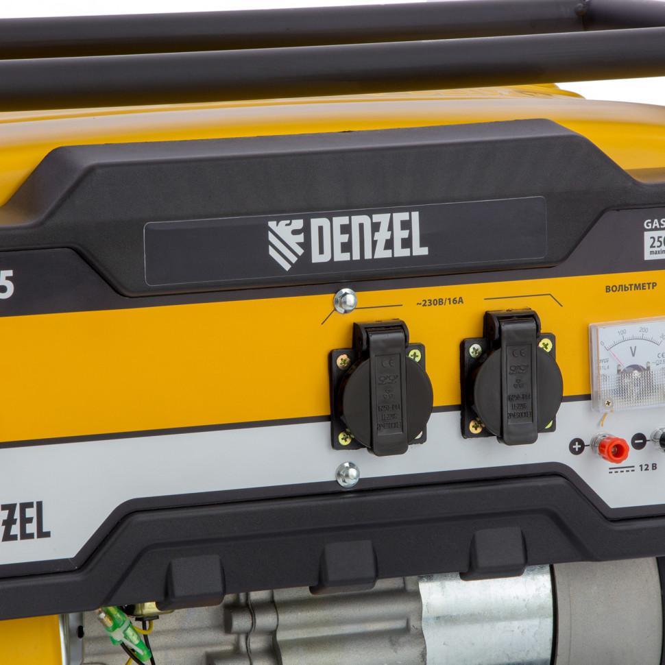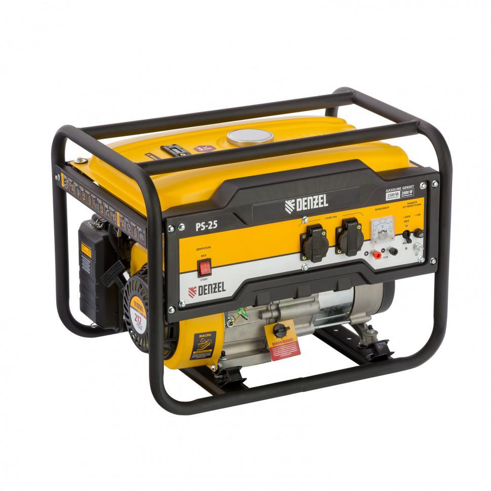 Генератор бензиновый Denzel PS-25 (946814) мощностью 2.5 кВт, с баком объемом 15 л, работает от сети 230 В и подходит для дачи, палаточного лагеря, рыбалки, торговой точки. Он дает возможность подключать маломощные приборы и инструменты. Например, можно одновременно подключить три лампы накаливания, утюг, пылесос, холодильник. С интуитивно понятным управлением справится даже новичок.Преимущества:- Надежность - металлический распредвал, чугунная гильза цилиндра, увеличенный диаметр провода обмотки статора и медная обмотка альтернатора обеспечивают стабильную работу генератора.- Возможность подключения чувствительной техники - блок AVR обеспечивает работу без скачков напряжения.- Безопасная работа - защита от короткого замыкания и перегрузки предохраняет двигатель от поломки.- Защита розеток - специальные крышки предотвращают попадание внутрь влаги и пыли.- Низкий расход топлива - на одной заправке генератор проработает более 12 часов.- Удобный контроль работы - встроенный вольтметр облегчает отслеживание напряжения, а индикатор уровня топлива помогает вовремя произвести дозаправку.- Датчик уровня масла - при недостаточном количестве масла генератор не запустится, что предотвращает выход из строя поршневой группы.- Удобная транспортировка - генератор весит всего 37 кг, что упрощает его перемещение.- Подтвержденное качество - гарантия на заводской брак действует 3 года.Комплектация:- генератор;- ключ свечной;- вилка 230В/16А (2 шт.);- провод зарядки аккумулятора;- руководство по эксплуатации;- гарантийный талон.Внешний вид и/или характеристики товара могут быть изменены производителем в соответствии с производственным процессом.