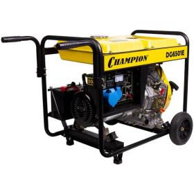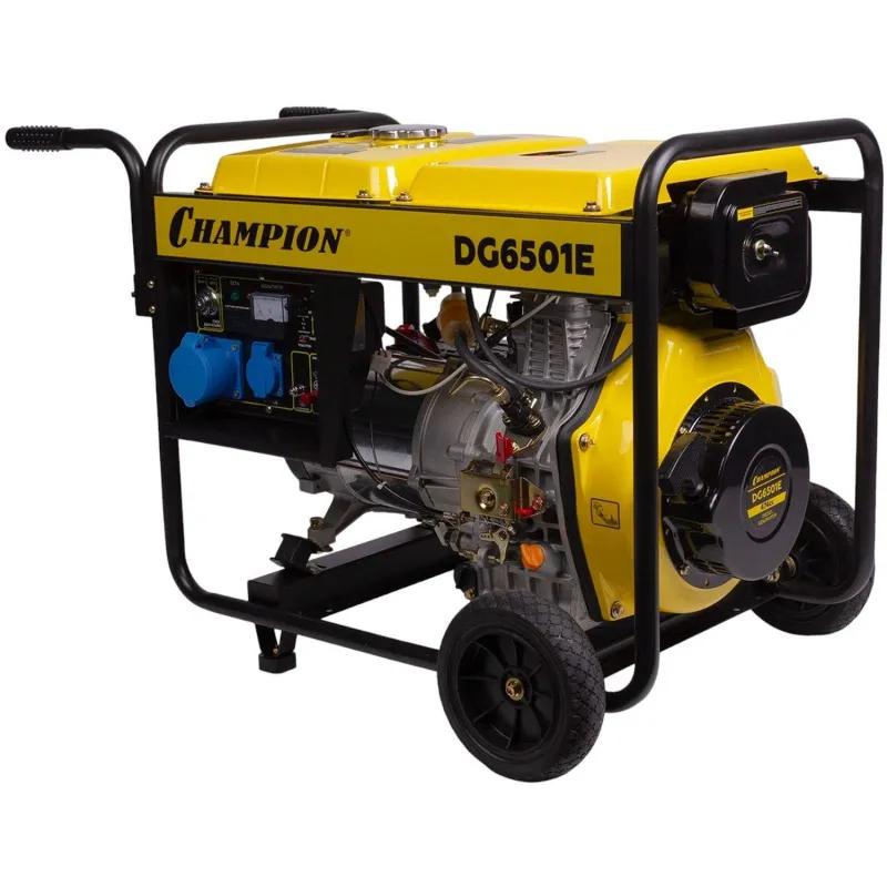 Генератор дизельный Champion DG6501E — дизельная электростанция средней мощности на транспортировочных колесах, предназначенная для организации резервного электроснабжения в загородном доме, питания электроинструмента на строительной площадке. <br><br>Преимущества: электростартер; защита от перегрузки; встроенный вольтметр; надежная металлическая рама.<br><br>Технические характеристики<br>• Работает на дизельном топливе. <br>• Расход топлива: 1,7 л/ч.<br>• Количество розеток: 3 шт.<br>• Мощность (макс.): 5.5 кВт;<br>• Мощность (ном.): 5 кВт;<br>• Номинальное напряжение: 220 В;<br>• Двигатель: 4-тактный с воздушным охлаждением;<br>• Объем двигателя: 474 см³;<br>• Мощность двигателя: 6.6 кВт/8.9 л.с.;<br>• Тип запуска: электростартер;<br>• Выходы: 2×220 В;1×12В<br>• Вес (нетто): 98 кг.<br><br>Внешний вид и/или характеристики товара могут быть изменены производителем в соответствии с производственным процессом.<br>