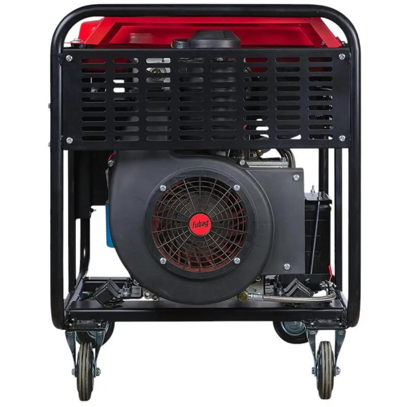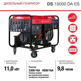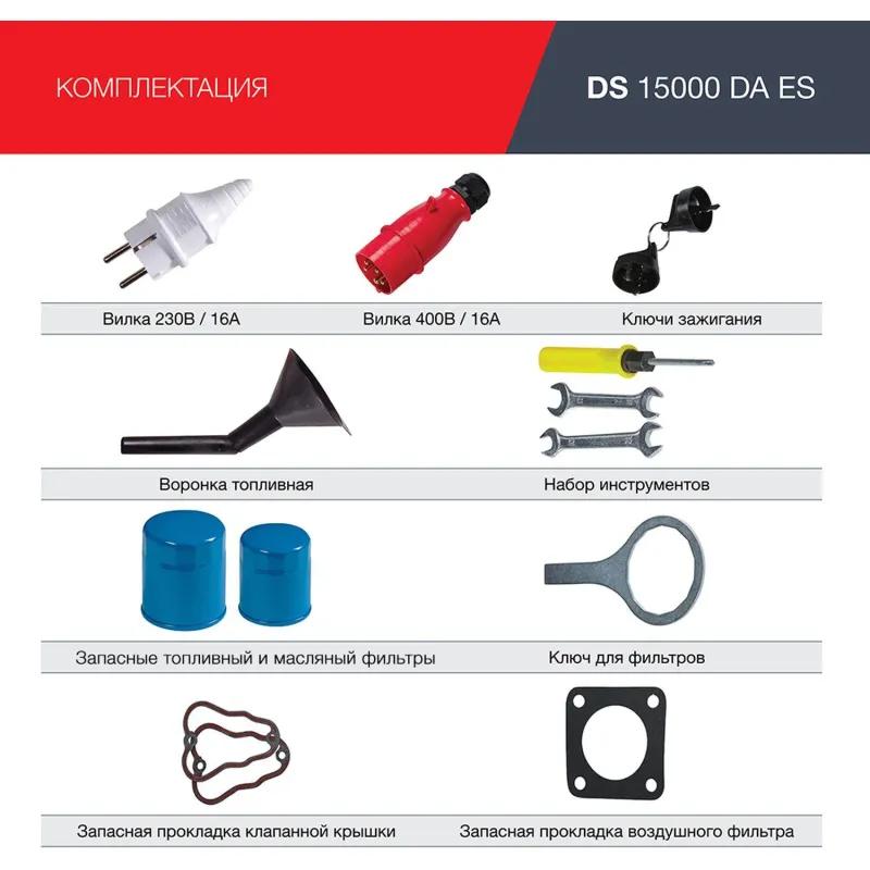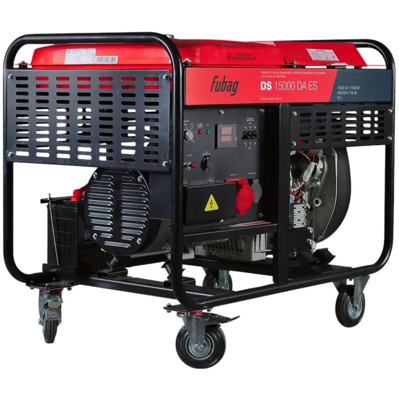 Генератор дизельный Fubag DS 15000 DA ES (646226)Дизельный трёхфазный генератор с профессиональным двухцилиндровым двигателем, электростартером и возможностью подключения блока автоматики. Лучший выбор для электроснабжения производств, стройплощадок, объектов жилищно-коммунального хозяйства. Наличие предпусковой системы подогрева воздуха облегчает запуск при отрицательных температурах. Топливный бак 25 л обеспечивает непрерывную работу без дозаправки в течение 10 часов при 75% нагрузке. Электростартер позволяет быстро запустить дизельный двигатель. Колёса и ручки в комплекте гарантируют удобную транспортировку.Комплектация- Генератор- Вилка SCHUKO 250В/16А- Вилка промышленная 400В/16А- Ключ на 14-17- Ключ на 10-12- Комплект колёс (4 шт)- Болты для крепления колёс (16 шт)- Отвёртка- Прокладка клапанной крышки (2 шт)- Прокладка воздушного фильтра- Топливный фильтр- Масляный фильтр- Ключ для масляного фильтра- Воронка топливная- Ключ (2 шт)- Инструкция эксплуатацииВнешний вид и/или характеристики товара могут быть изменены производителем в соответствии с производственным процессом.