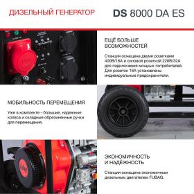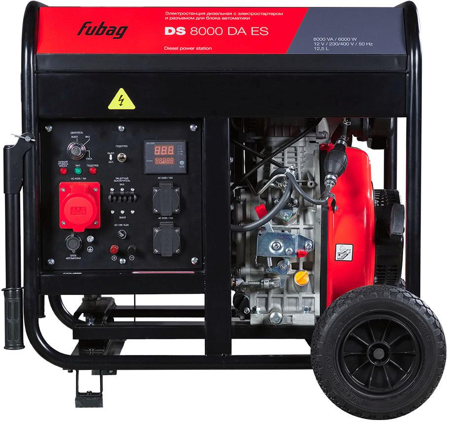 Генератор дизельный Fubag DS 8000 DA ES (646236)Дизельный трёхфазный генератор с экономичным двигателем, электростартером и возможностью подключения блока автоматики. Подходит в качестве источника питания оборудования высокой мощности на стройплощадках или в загородном доме. Наличие предпусковой системы подогрева воздуха облегчает запуск при отрицательных температурах. Топливный бак 12,5 л обеспечивает непрерывную работу без дозаправки в течение 8 часов при 75% нагрузке. Электростартер позволяет быстро запустить дизельный двигатель. Колёса и ручки в комплекте гарантируют удобную транспортировку.Комплектация- Генератор- 1 вилка 250V/16A- 1 вилка 400V/13A- Ключи 8-10, 14-17, 13-16- Транспортировочный набор колёс и ручек- Топливная воронка- Ключ- Кабели для зарядки аккумулятора- Инструкция по эксплуатацииВнешний вид и/или характеристики товара могут быть изменены производителем в соответствии с производственным процессом.
