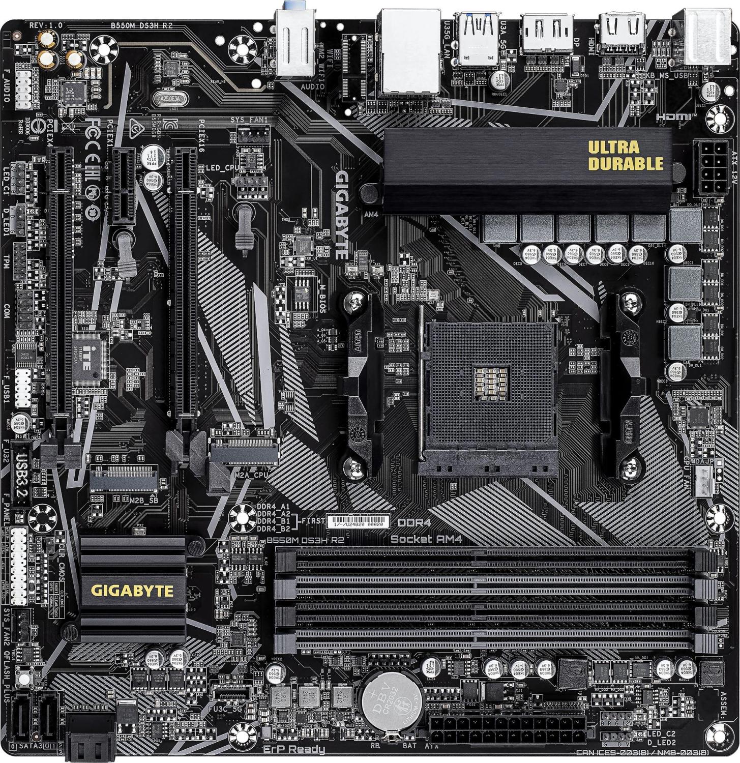 GIGABYTE B550M DS3H R2 предлагает разнообразные интерфейсы: PCIe 4.0 для высокоскоростных видеокарт, разъемы M.2 (PCIe x4/SATA III) для установки быстрых SSD, а также множество USB портов для подключения периферии.