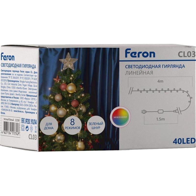 Гирлянда светодиодная Feron нить разноцветный свет 40 светодиодов (4м)<br><br>Гирлянда линейная Feron CL03 — яркое и многофункциональное освещение для использования внутри помещений. Длина основной линии составляет 4 метра, дополнительно предусмотрен 1,5-метровый зелёный кабель питания. В конструкции установлено 40 энергоэффективных светодиодов, которые меняют цвета, создавая эффект «мультиколор».<br>Управление цветом и режимами свечения осуществляется с помощью удобного контроллера, который входит в комплект. Гирлянда подключается напрямую к сети 230 В, при этом последовательное соединение гирлянд не поддерживается.<br><br>Технические характеристики:<br>1. Общая длина: 4 м + 1,5 м питания.<br>2. Количество LED: 40.<br>3. Расстояние между светодиодами: 10 см.<br>4. Мощность: 2,4 Вт.<br>5. Цвет свечения: мультиколор с управлением контроллером.<br>6. Климатический класс: IP20 (для использования внутри помещений).<br><br>Эта гирлянда станет отличным украшением для создания праздничной или уютной атмосферы в доме, офисе или магазине.