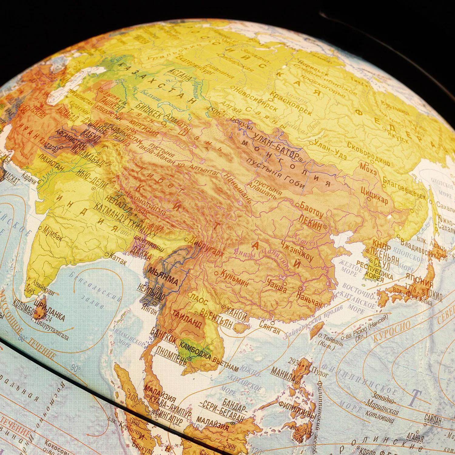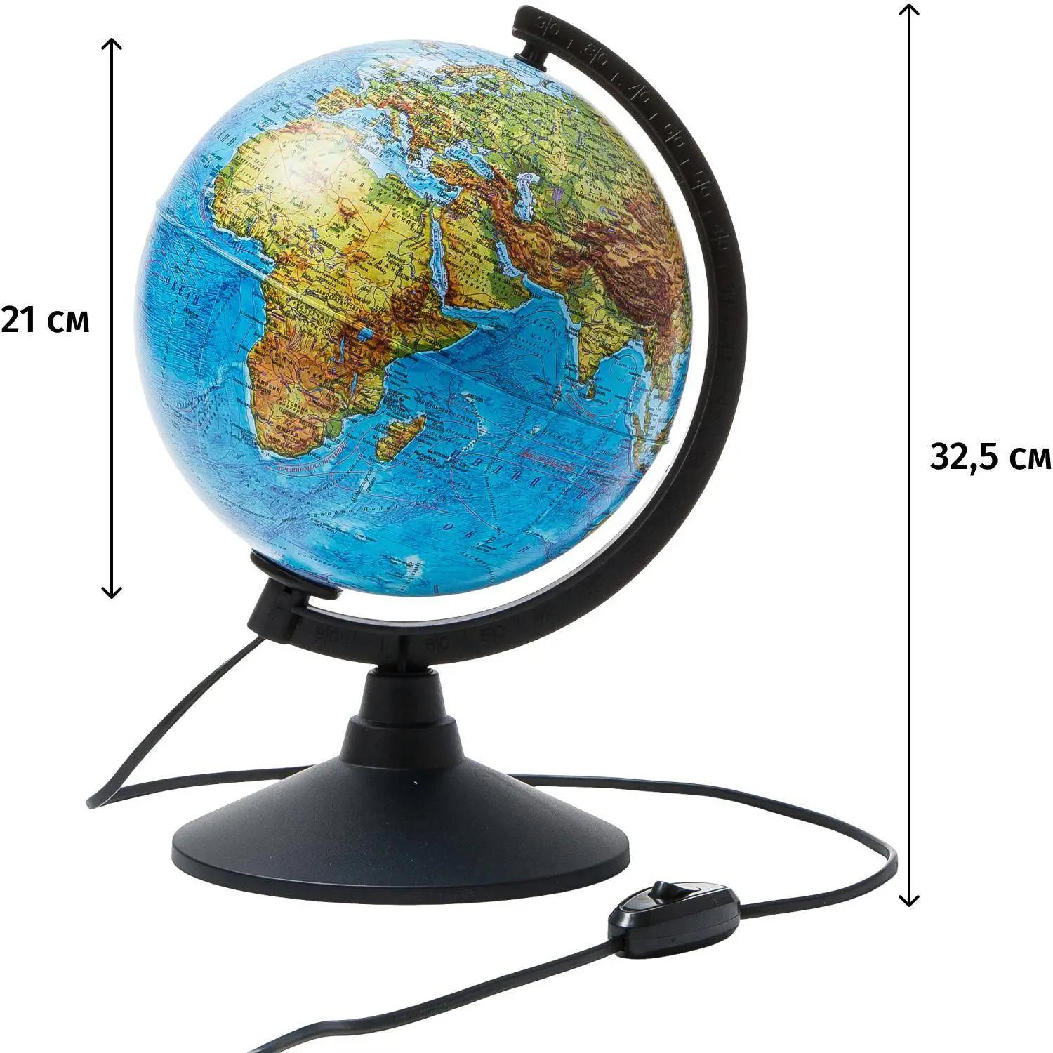 Глобус Globen Классик физико-политический 21 см с подсветкой<br> <br> Глобус — идеальное учебное пособие для изучения географии в школе и дома. На карту глобуса нанесены страны мира, названия городов и другая полезная информация. При включении подсветки глобус превращается в наглядную политическую карту: чётко выделяются границы стран, каждая из которых окрашена в свой цвет. В вечернее и ночное время глобус можно использовать как ночник. Подставка глобуса выполнена из высококачественного пластика чёрного цвета. Размер глобуса: 32,5×23,5 см. Питание от сети, в комплекте поставляется шнур с выключателем.