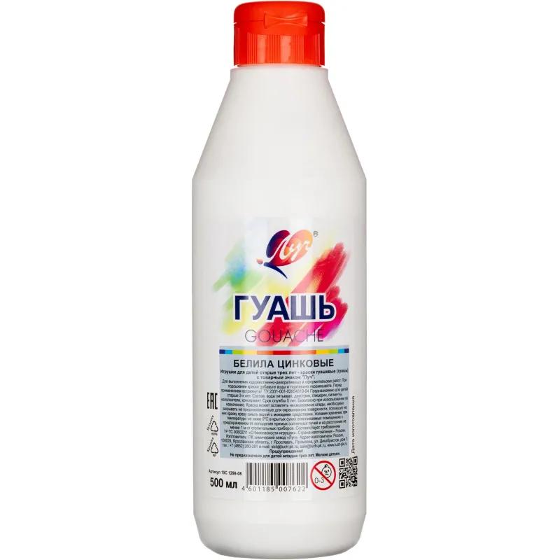 Гуашь Луч Белила цинковые 500 мл<br><br>Изготовлена на основе натуральных компонентов и высококачественных пигментов. Цинковые белила используются в сочетании с другими красками, так как в сравнении с титановыми они более прозрачны, что дает возможность создавать различные оттенки. Гуашь находится в пластиковой герметичной бутылочке. Поставляется без кисти..